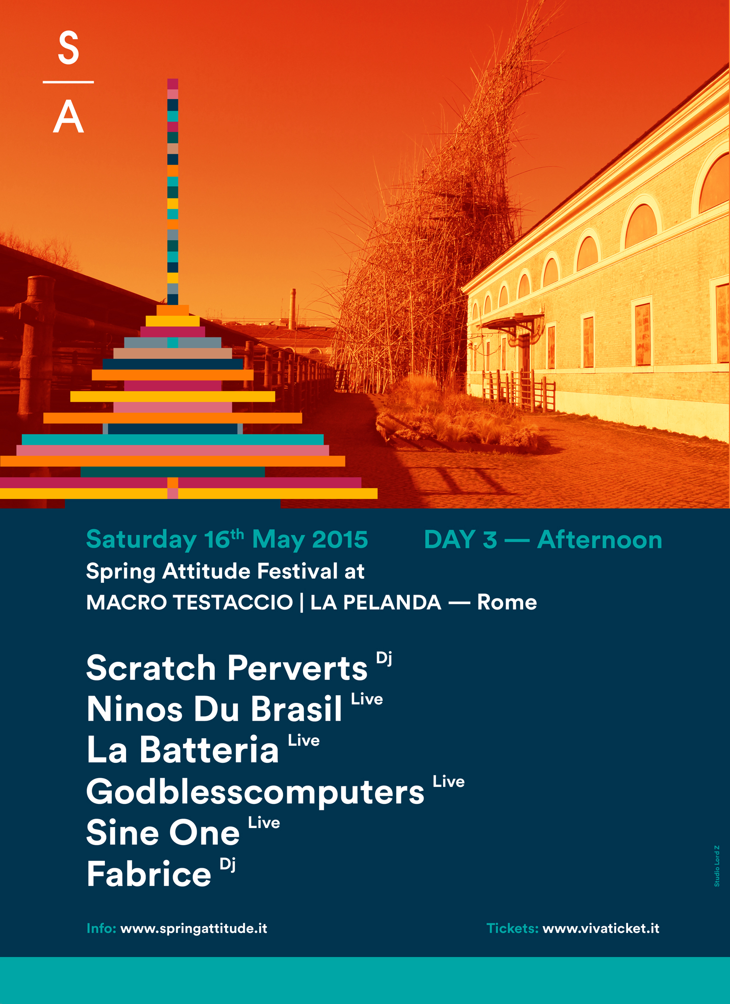 Sabato 16 maggio 2015 costano 10 euro i biglietti, acquistabili direttamente al Macro Testaccio, per l’evento del pomeriggio alla Factory con SCRATCH PERVERTS, NINOS DU BRASIL, LA BATTERIA, GODBLESSCOMPUTER, SINE ONE, FABRICE.