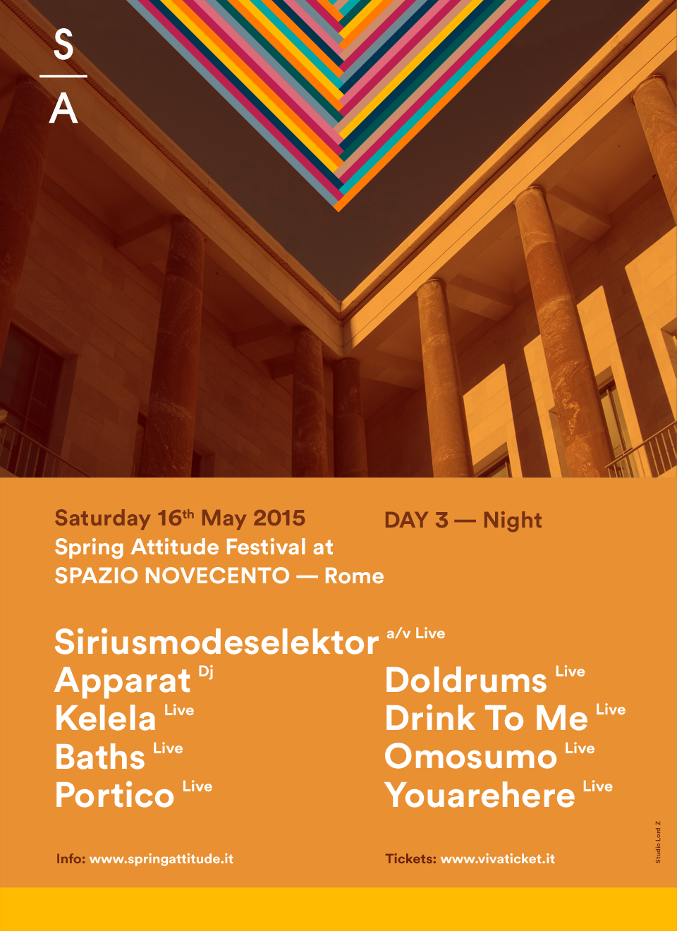 Il clou di Sabato 16 è allo Spazio Novecento: costa 32 euro più diritti di prevendita o 35 euro al botteghino assistere alle performance di APPARAT, SIRIUSMODESELEKTOR, BATHS, PORTICO, KELELA, DOLDRUMS, DRINK TO ME, OMOSUMO, YOUAREHERE.