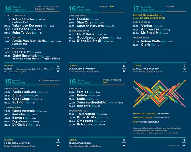 Infine a 10 euro si potrà ballare al Closing Party nella Factory al Macro Testaccio con le selezioni di Clark, Indian Wells ed altri. Spiega il sito ufficiale di Spring Attitude: