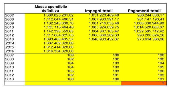 L’approccio è stato quello di utilizzare documenti contabili omogenei (i consuntivi) e confrontare variabili finanziarie comparabili (la massa spendibile definitiva, MSD, gli impegni di spesa totali, IT, i pagamenti totali, PT). Per questo le considerazioni sulle proiezioni del triennio 2014 – 2016, riferite agli stanziamenti di competenza, sono state utilizzate solo per considerare gli andamenti tendenziali. Il tasso di convenzionalità dei documenti contabili rischia, infatti, di fornire indicazioni fuorvianti, se si confrontano documenti tra loro diversi.