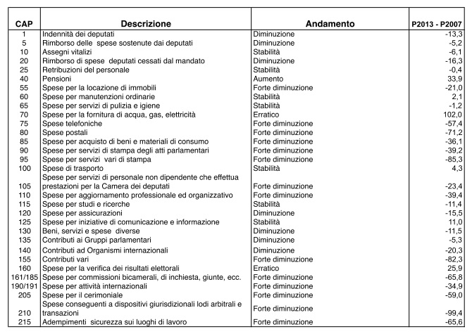 Fatto 100 la spesa primaria delle PA nel 2007 la tabella mostra una crescita fino al 2009 e una successiva stabilizzazione nel periodo seguente. Lo stesso profilo, con intensità minore, mostra la colonna del bilancio della camera (sono stati considerati i pagamenti il cui andamento peraltro non si discosta dalle altre variabili considerate). La differenza tra gli andamenti si riscontra nell’ultimo biennio, in cui le uscite del bilancio della camera flettono significativamente, riportandosi al valore d’inizio periodo.