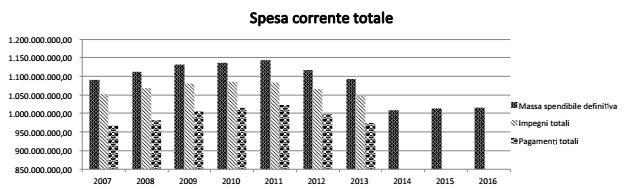 Un approccio bottom-up non impedisce un confronto complessivo. La spesa corrente totale, come si evince dalla tabella, mostra un andamento costante in termini nominali, a fronte di un incremento, per lo stesso periodo, di undici punti della spesa primaria complessiva delle pubbliche amministrazioni.
