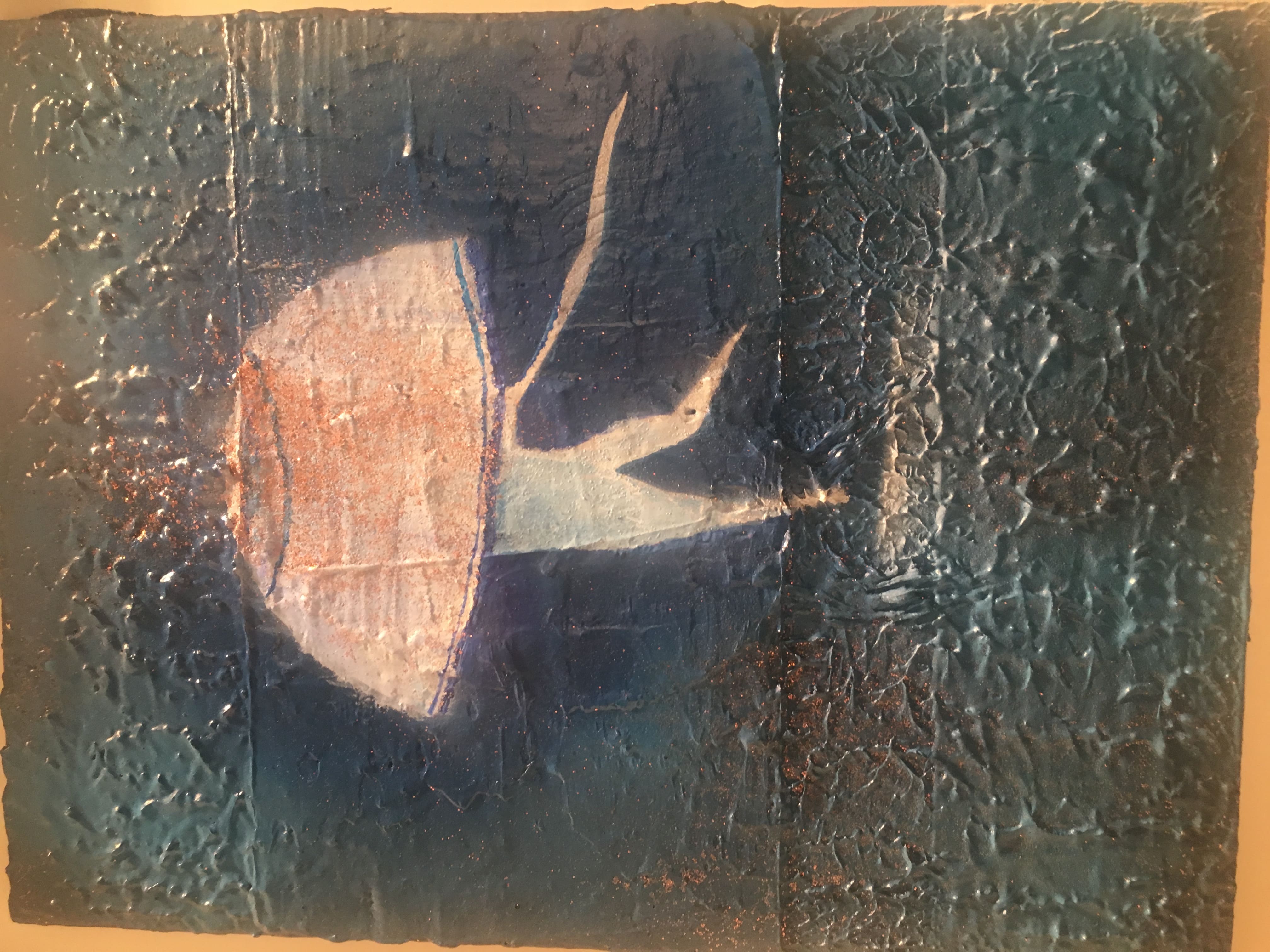 Non vuole sconvolgerli ritraendoli, anzi. E se no perchè userebbe tecniche così raffinate come quella di spargere un fondo giallo sulla tela sopra una manciata di sassolini, per poi estrarre dal fondo le pietruzze e lasciare l’immagine perfetta del contorno marino per far nuotare il pesce giusto per quella scena?