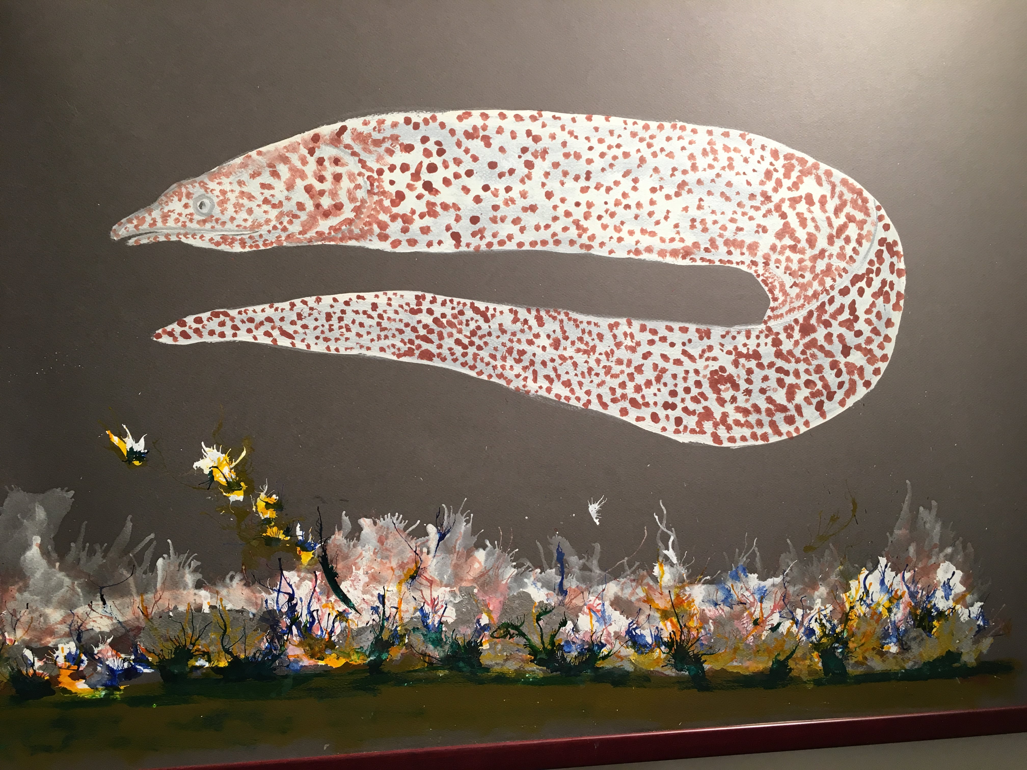 Passi dalla maestosità di quel tonno blù alla medusa con movenze da ballerina, ai pesci innamorati “però non ancora del tutto”, come precisa acutamente l’artista, passi all’incontro “impossibile” tra il barracuda e il pesce Paradiso, passi al sogno, perchè anche i pesci di Rognoni possono permettersi di sognare, e scopri che il viaggio dell’artista negli abissi colorati deve essere stato come una folgorazione, sopratutto colorata.