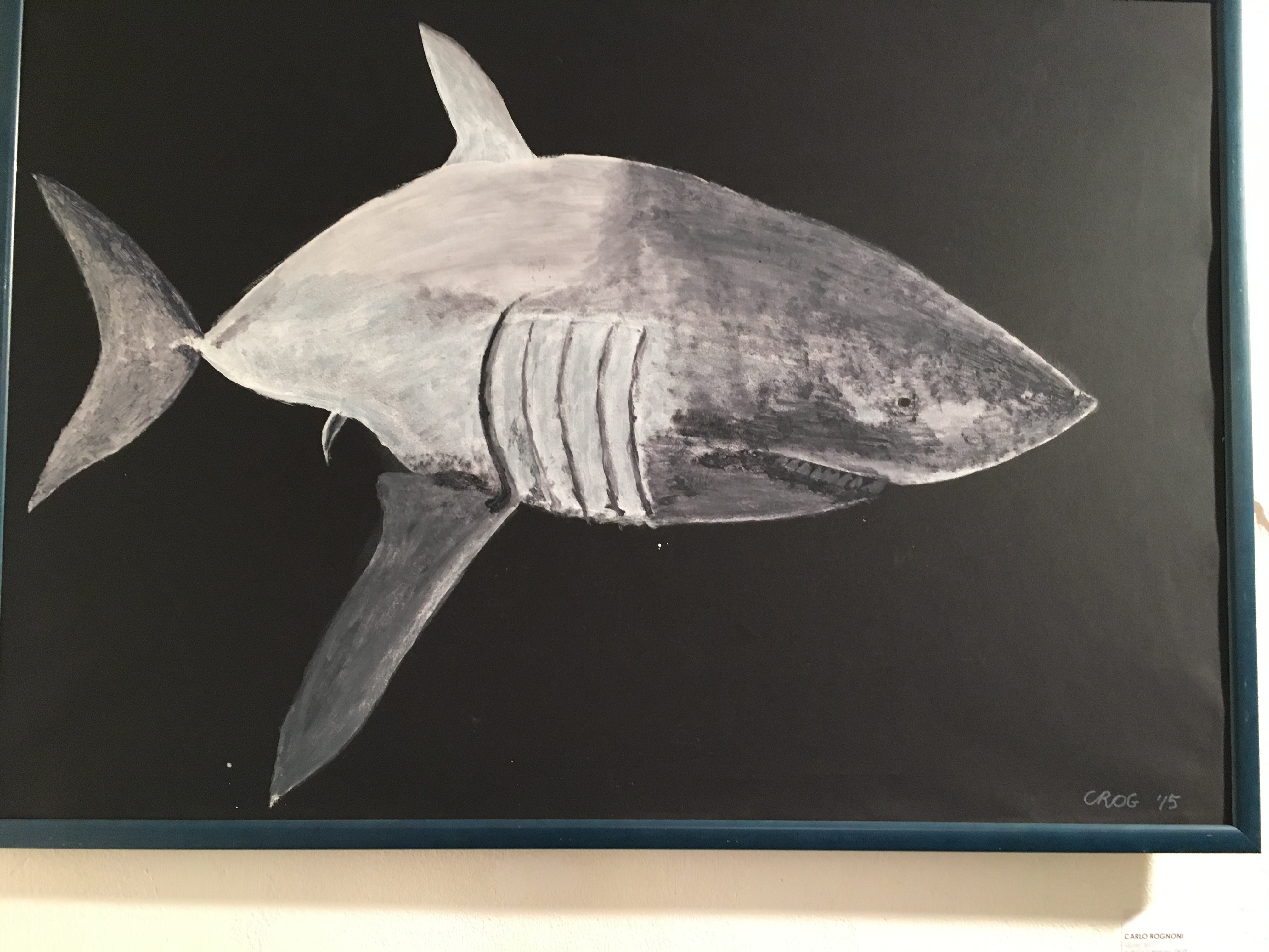 Nella foto: lo squalo dipinto da Rognoni. Tra i vecchi militanti genovesi che hanno visitato la mostra molti hanno pensato allo stesso nome...