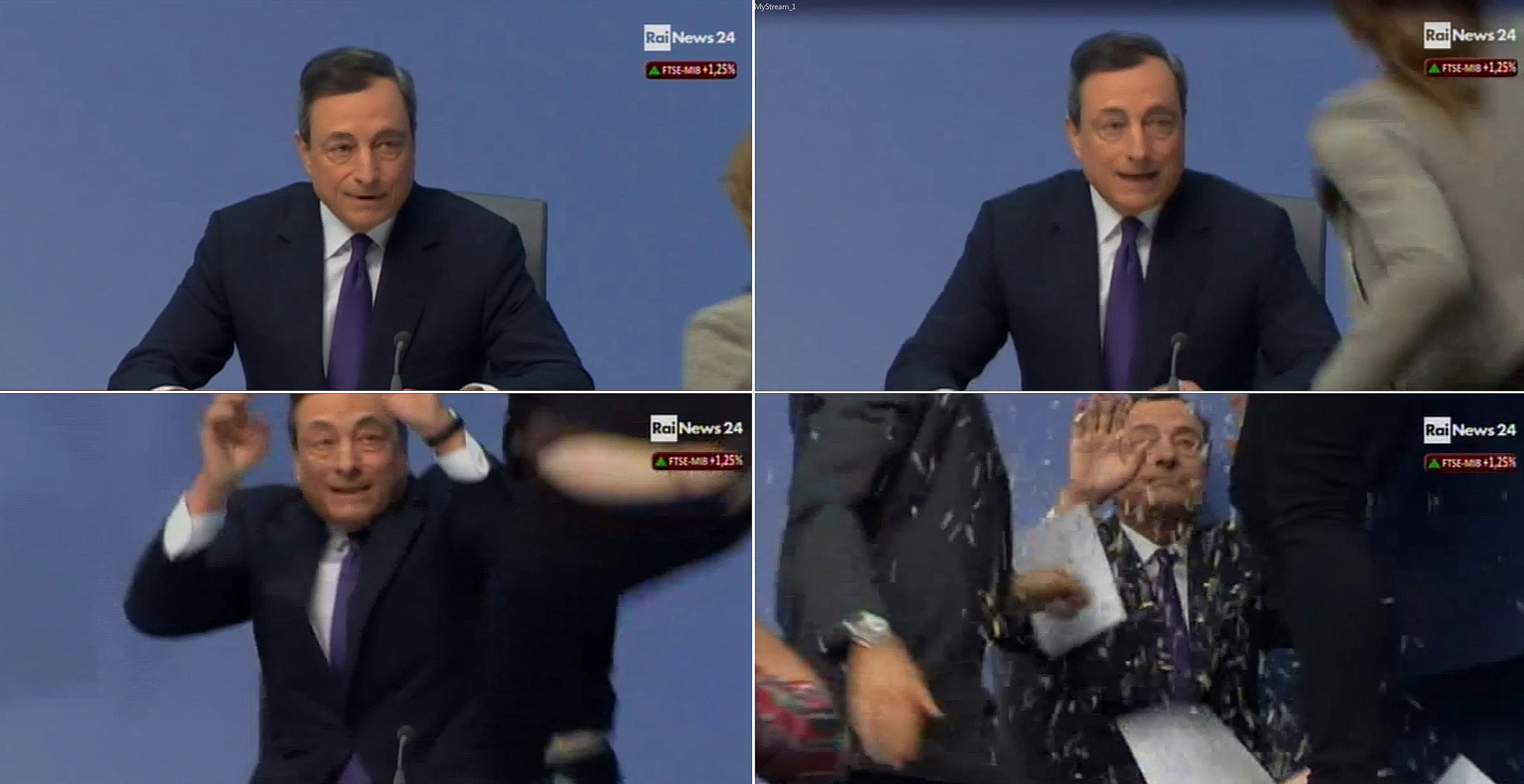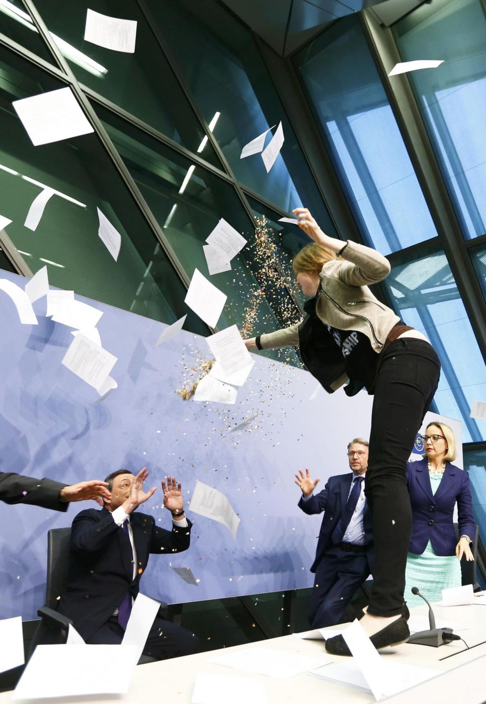 Un altro giorno, Francoforte, conferenza stampa di mario Draghi presidente Bce. Josephine Witt, presto ribattezzata Kung fu tanga (se ne è doluta ma è tra le sue precedenti performance quella di mostrare il seno nudo in chiesa, ovviamente per protesta) ha “occupyto” il tavolo cui sedeva Draghi saltandoci sopra e soprattutto ha voluto lanciare l’accusa di Bce-dittatura. Fosse solo per le allegre Josephine che ci sono in giro, si potrebbe sorvolare. Il fatto è però che decine, centinaia di migliaia e forse più di cittadini europei, anzi sicuramente milioni, sono convinti che la Bce sia oggi il nemico, l’obiettivo da colpire. A migliaia ci hanno provato non metaforicamente in piazza, di recente appunto a Francoforte.
