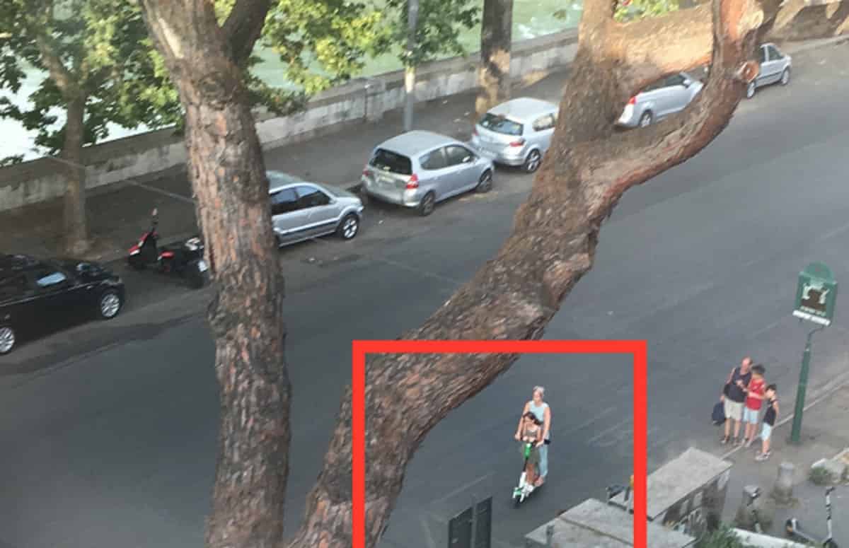 Monopattini, ecco la prova del pericolo: madre con bambina contromano a Roma, senza legge marciapiedi come piste