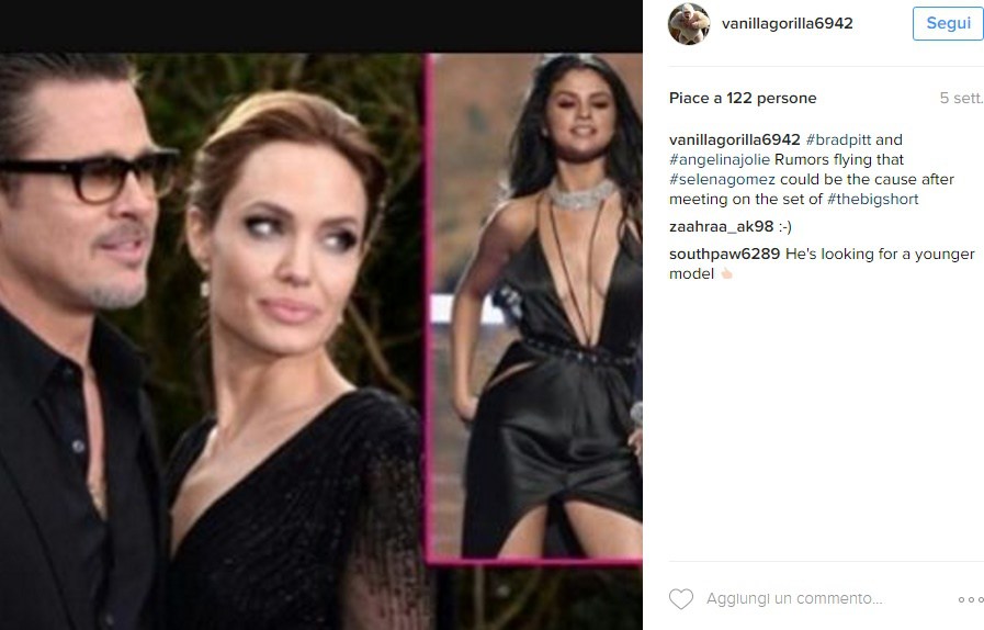 “Angie si è arrabbiata quando ha visto su Instagram la foto si Selena e ha sentito da alcuni amici di come Brad e Selena flirtavano spudoratamente. Ora Selena si è vantata con tutti che farà un nuovo film con Brad Pitt. Selena sta andando in giro chiamando con ironia Brad “il mio futuro marito” e Angie, ovviamente, non è contenta”. Sempre secondo la rivista, Angelina qualche tempo fa avrebbe chiesto a Brad di non fare più film con Selena”.