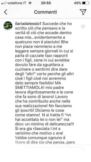 Sulle cene di 20/30 persone di cui parla Anna Tatangelo, Ilaria ha questa opinione: “Le cene di 20/30 persone a cui ‘faticosamente’ ha dovuto cucinare, era sempre e comunque affiancata da persone che umilmente e con gentilezza ci aiutano con le faccende domestiche; il ‘rumore’ nient’altro che cene in cui mio padre, ‘il classico napoletano’, faceva, fa e continuerà a fare, se Dio lo vorrà, per lavoro. Sempre e unicamente per lavoro, lo stesso lavoro che ha permesso me, i miei fratelli e la mia famiglia di condurre una vita dignitosa e perché non dirlo, lo stesso lavoro che ha contribuito alla sua realizzazione e al ‘girare senza vestiti dopo una doccia, nel silenzio delle sue stanze’. Io non posso accettare che si debba parlare di mio padre in questo modo! Quando se ne è andata da casa non ha nemmeno detto: ciao!”.