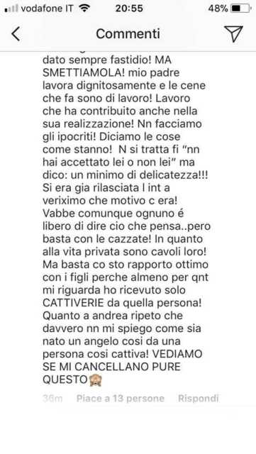 E, ancora: “Poi, ‘pensavo che la scelta migliore fosse restare in silenzio per rispetto degli altri’. Ma siamo seri? gli altri? ma forse sei tu l’altra! Non noi! Non noi famiglia consolidata da anni! L’amore che nutro per mio padre è unico e indissolubile, io sono certa che lui sceglierà cosa è meglio per il suo animo buono e nel rispetto soprattutto di mio fratello Andrea (un angelo partorito da un diavolo ancora non me lo spiego). Quanto a te, smettila di dire cazzate sulla vita di un uomo (un minimo di rispetto) e sul rapporto fantomatico che avresti con i figli perché non è vero! Non lo è. E se non sei stata accettata è perché prima tu non hai accettato noi, si è sempre visto, l’abbiamo sempre saputo e percepito. Ma un segreto vorrei dirtelo: tu sei arrivata dopo!”.