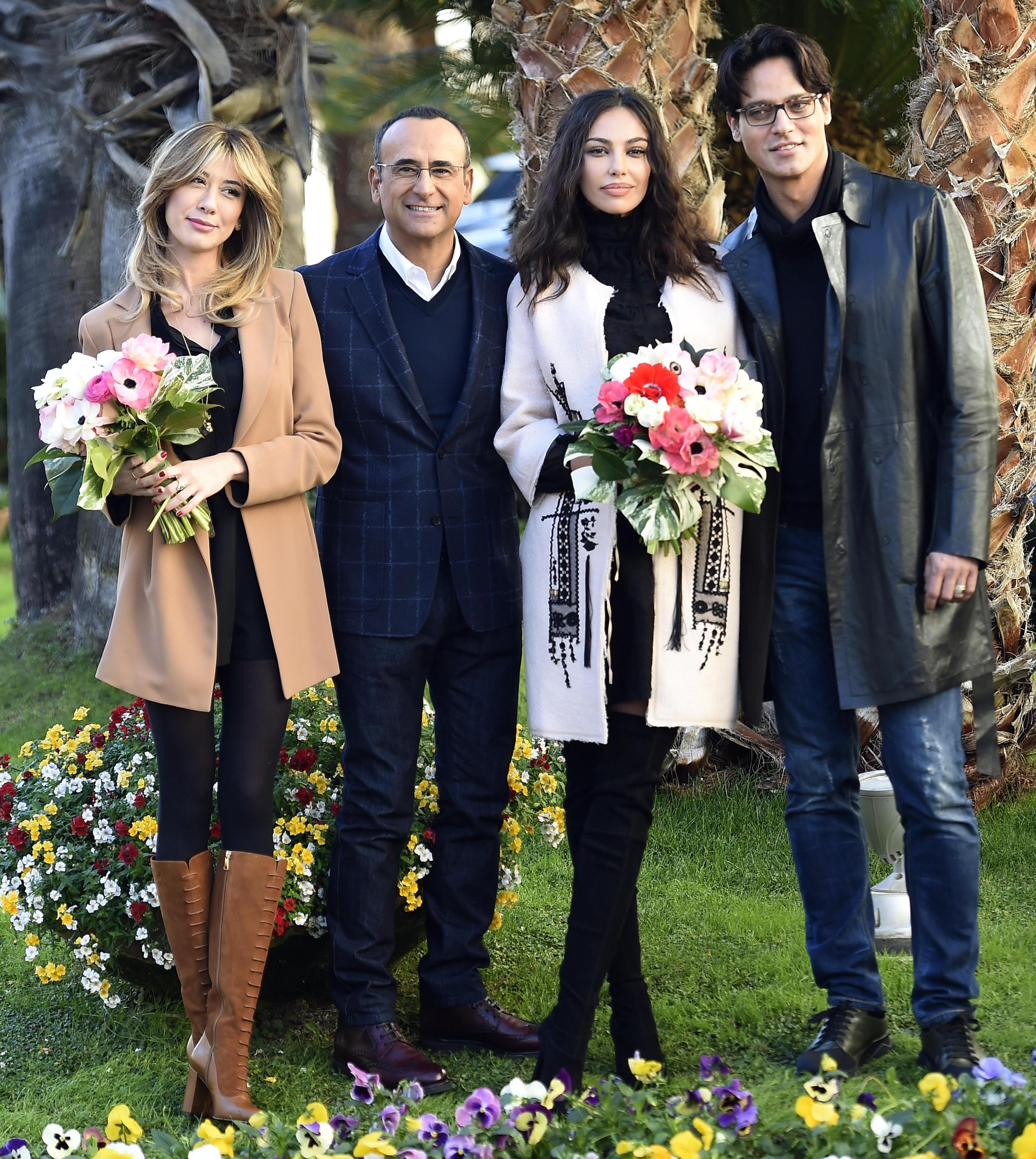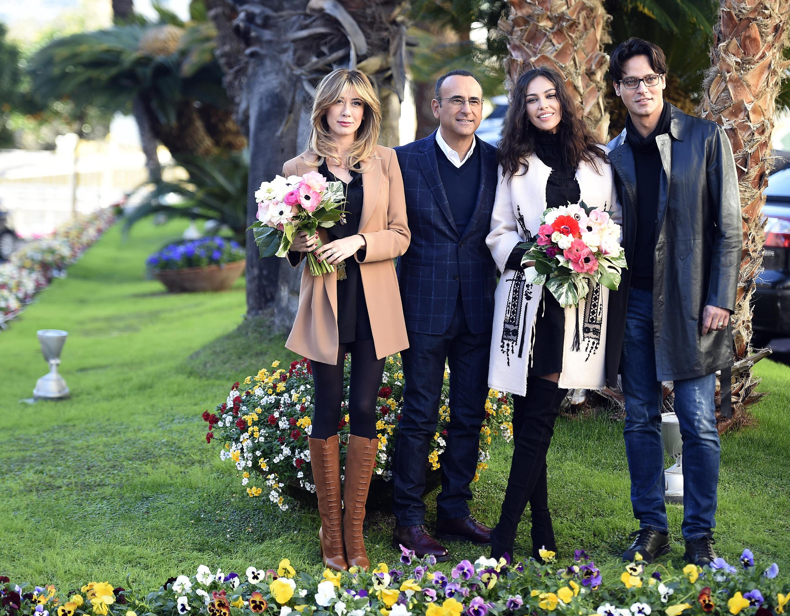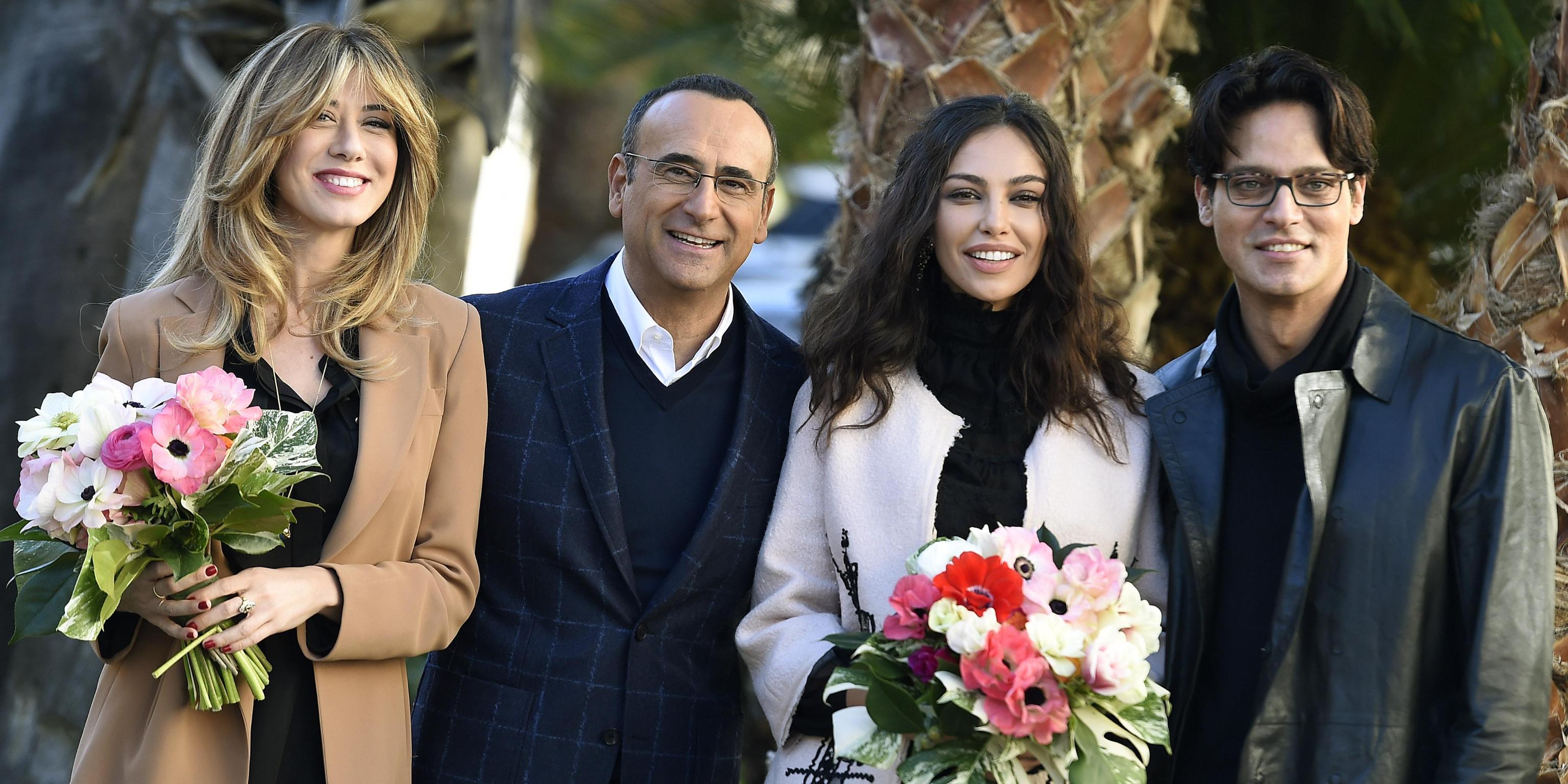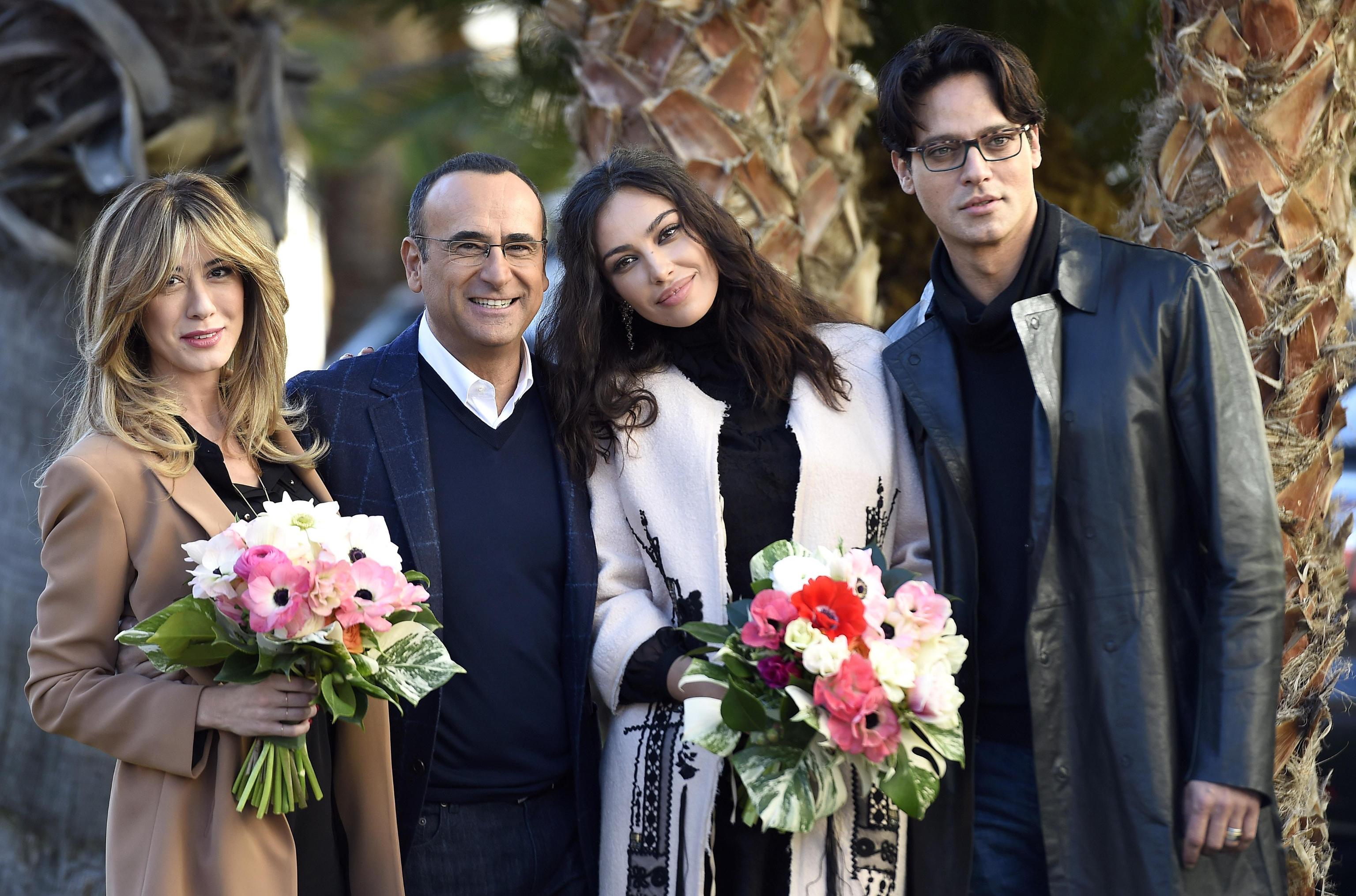 Virginia Raffaele con gli altri conduttori di Sanremo 2016 (foto Ansa).