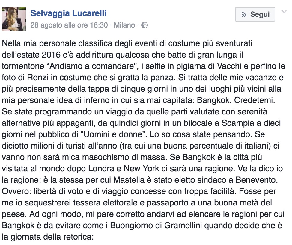 “Se 18 milioni di persone all’anno ci vengono non sarà mica masochismo di massa. Se Bangkok è la città più visitata al mondo dopo Londra e New York ci sarà una ragione. Ve la dico io la ragione: è la stessa per cui Mastella è stato eletto sindaco a Benevento. Ovvero: libertà di voto e di viaggio concesse con troppa facilità. Io sequestrerei tessera elettorale e passaporto ad una buona metà del paese”.