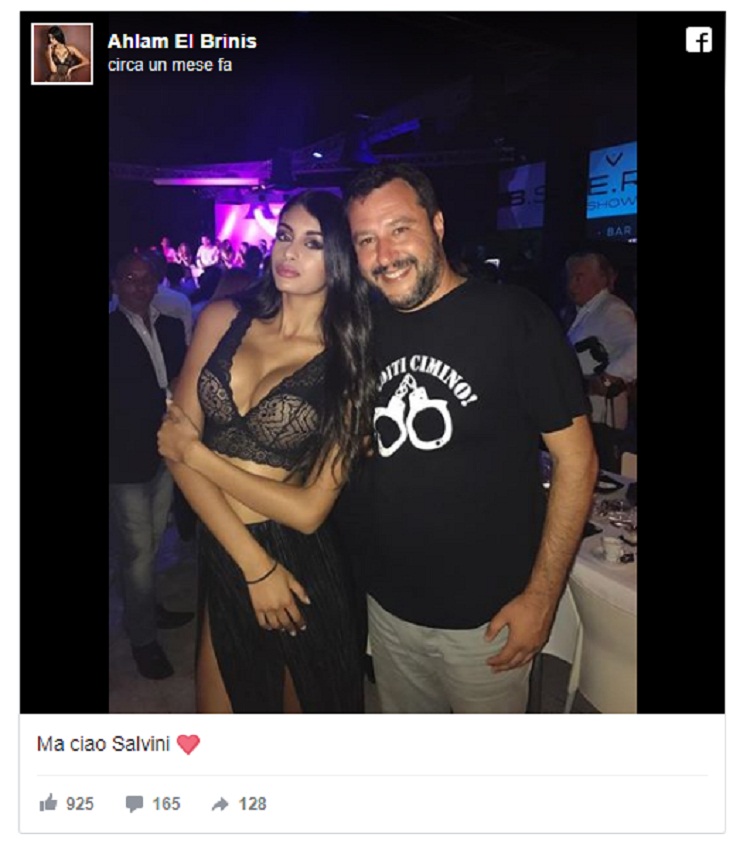 MILANO – Se Elisa Isoardi bacia altri uomini a Ibiza, Matteo Salvini non se ne sta certo a guardare. Dopo le foto del settimanale Chi che avevano paparazzato la bella conduttrice a Ibiza tra le braccia di “vecchio amico gay” (parole sue), il leader della Lega Nord sarebbe a sua volta stato immortalato in compagnia di un’altra. Lei è Ahlam El Brinis, modella marocchina dalle curve mozzafiato, con la quale era già stato pizzicato un mese prima.