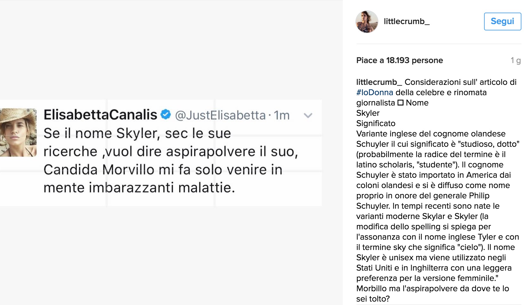 Citando l’esempio di Skyler, Morvillo ha scritto: “Elisabetta Canalis chiama la figlia come un aspirapolvere”. Nel giro di poche ore è arrivata la difesa a spada tratta della Canalis, via social network: “Se il nome Skyler, secondo le sue ricerche, vuol dire aspirapolvere il suo, Candida Morvillo mi fa solo venire in mente imbarazzanti malattie”.