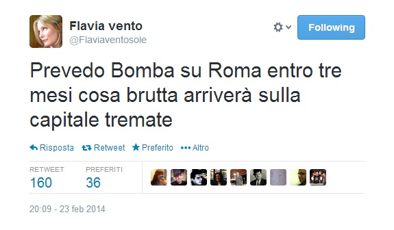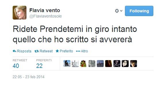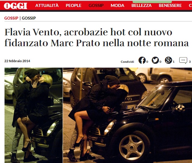 Ahiahiai Flavia Vento: se non ci fosse bisognerebbe inventarla! Svampita quanto basta, ingenua quando vuole, sicuramente pura come una moderna Alice in the Wonderland, ha appena rivelato di essere anche casta: non fa sesso da 3 anni. Resta fedele nei secoli al suo unico grande amore (ahimè non corrisposto!): il divo di Hollywood Leonardo DiCaprio. Sono anni che Flavia coltiva questa cotta bruciante che non accenna a passare per la star del “Titanic”. Che conobbe a Roma tanti anni fa. Ricordo ancora una memorabile serata al “Max” di Viale Liegi: entrò DiCaprio proprio mentre Flavia doveva cantare una canzone e per poco non svenne dall’emozione di trovarsi il suo idolo lì a portata di mano ad ascoltarla. Ogni volta che Leo viene a Roma per un film, lei chiama gli amici gossippari come me per sapere dove alloggia, dove va, dove poterlo incontrare (casualmente). Insomma, la sua è quasi una dolce ossessione. Tanto che ormai DiCaprio se lo sogna anche da sveglia.