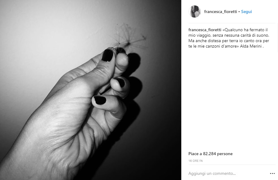 ROMA – Francesca Fioretti dedica alcuni versi di Alda Merini a Davide Astori, suo compagno, scomparso tragicamente lo scorso 4 marzo in una camera d’albergo a Udine mentre era in ritiro con la Fiorentina.