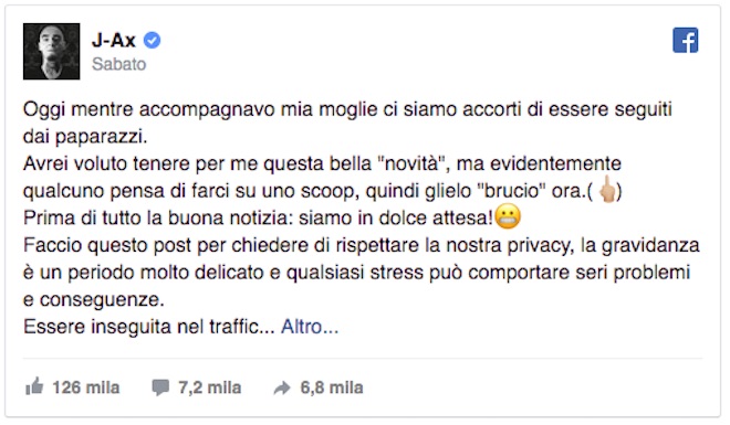 J-Ax non nasconde il fatto che voleva tenere per sé questa “bella novità” ma si è accorto che oggi, mentre accompagnava la moglie, era seguito dai paparazzi. “Evidentemente – scrive – qualcuno pensa di farci su uno scoop, quindi glielo “brucio” ora”.