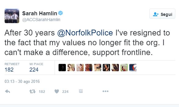 Lorne Greene, commissario di polizia di Norfolk, ha commentato così la scelta della donna: “Mi è dispiaciuto sentire la notizia che Sarah Hamlin lascerà la polizia di Norfolk (…) ho avuto l’opportunità di lavorare con lei più volte e sono rimasto colpito dal suo impegno e dalla sua professionalità”.
