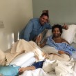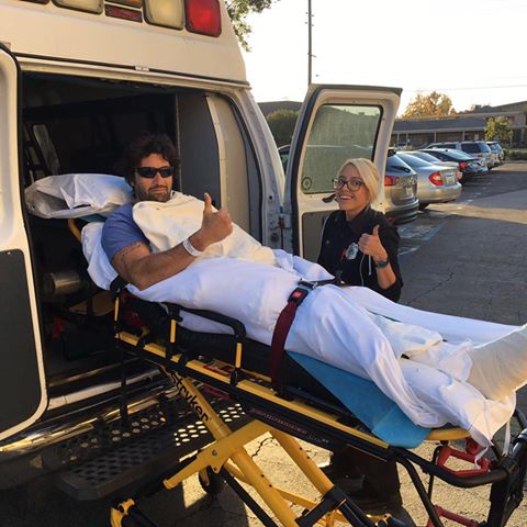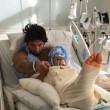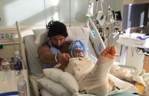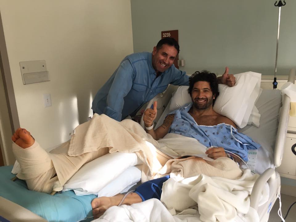 Nella prima foto si vede l’attore sulla barella dell’ambulanza. Poi le immagini dal letto di ospedale con gesso, lastre e tutori a sorreggere una gamba malridotta. Infine la foto che rassicura i fan: Nudo è sorridente insieme agli amici che sono andati a trovarlo.