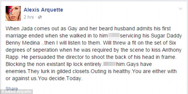 “Quando Jada si dichiarerà gay e suo marito ammetterà che il primo matrimonio è finito perché fu trovato a servire il culo allo Sugar Daddy Benny Medina, allora, a quel punto, li ascolterò”.