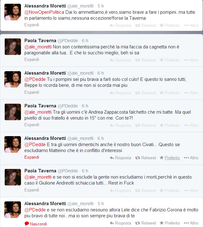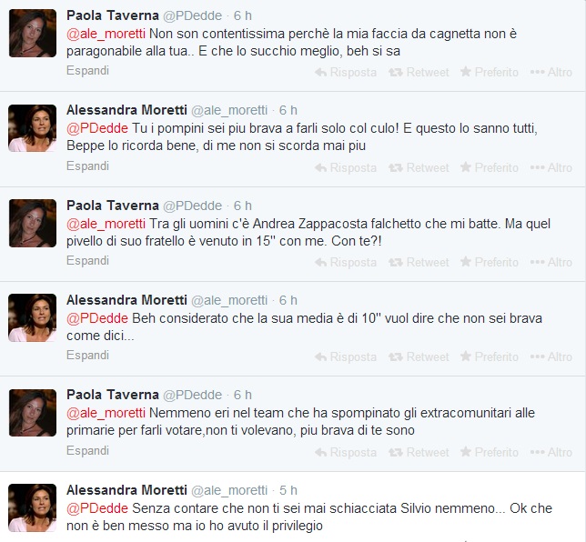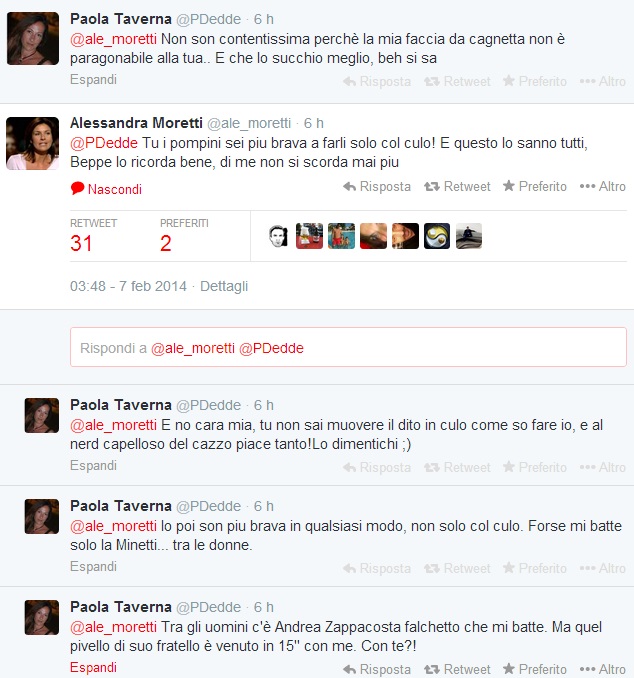 Quasi tutti irripetibili gli scambi a sfondo erotico ai quali i profili hackerati delle due deputate hanno dato vita nella notte. Tra i tweet apparsi uno proveniente dal profilo Alessandra Moretti recitava, anche in questo caso con chiaro riferimento sessuale: “@Pdedde vero? Ci hai provato e riprovato ma nulla da fare, non sei brava. Devi migliorare se no ti fanno fuori Beppe e Casa”. Oltre al riferimento alle fellatio, si fa riferimento anche al sesso anale e si tira in ballo Nicole Minetti.