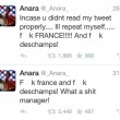 PARIGI, FRANCIA – “Fuck France and fuck Deschamps!”: questo il tweet postato ieri sera da Anara Atanes, giovane e avvenente modella, fidanzata di Samir Nasri, talento francese del Manchester City, non convocato per i Mondiali dal ct Didier Deschamps.