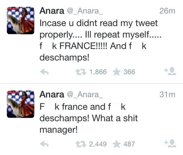 PARIGI, FRANCIA – “Fuck France and fuck Deschamps!”: questo il tweet postato ieri sera da Anara Atanes, giovane e avvenente modella, fidanzata di Samir Nasri, talento francese del Manchester City, non convocato per i Mondiali dal ct Didier Deschamps.