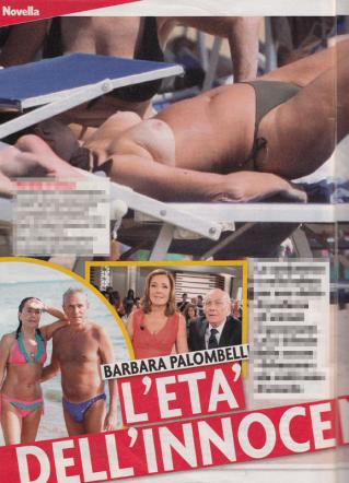 “Nella bufera per le sue recenti dichiarazioni a favore degli animali e un po’ meno dei “nostri eroi di governo”, la Palombelli, che si difende con un pacato: “scherzavo”, si è concessa una pausa relax sul lettino nella spiaggia di Sabaudia. Abbronzatura rigorosamente integrale sul lato A e quindi bando al reggiseno. Volontario o involontario che sia il topless della bella conduttrice non sfugge ai paparazzi appostati. Barbara non batte ciglio, non ha nulla da nascondere lei e l’unico corpo del reato è il suo, promosso con tanto di applauso”.