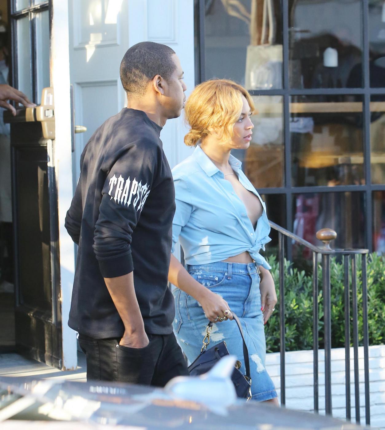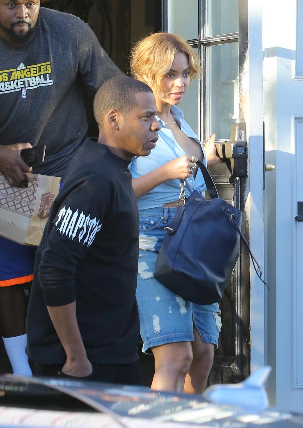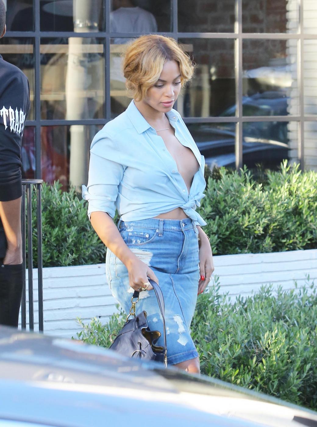 LOS ANGLES – Beyoncé va a pranzo col marito Jay Z e sfodera un nude look che ha attirato i paparazzi. La popstar ha infatti lasciato a casa il reggiseno e le immagini di questa passeggiata sotto al sole di West Hollywood stanno ora facendo il giro del web. Per essere sicura che la “dimenticanza” (voluta?) non passasse inosservata ha aperto completamente la camicia di jeans sul decolleté.