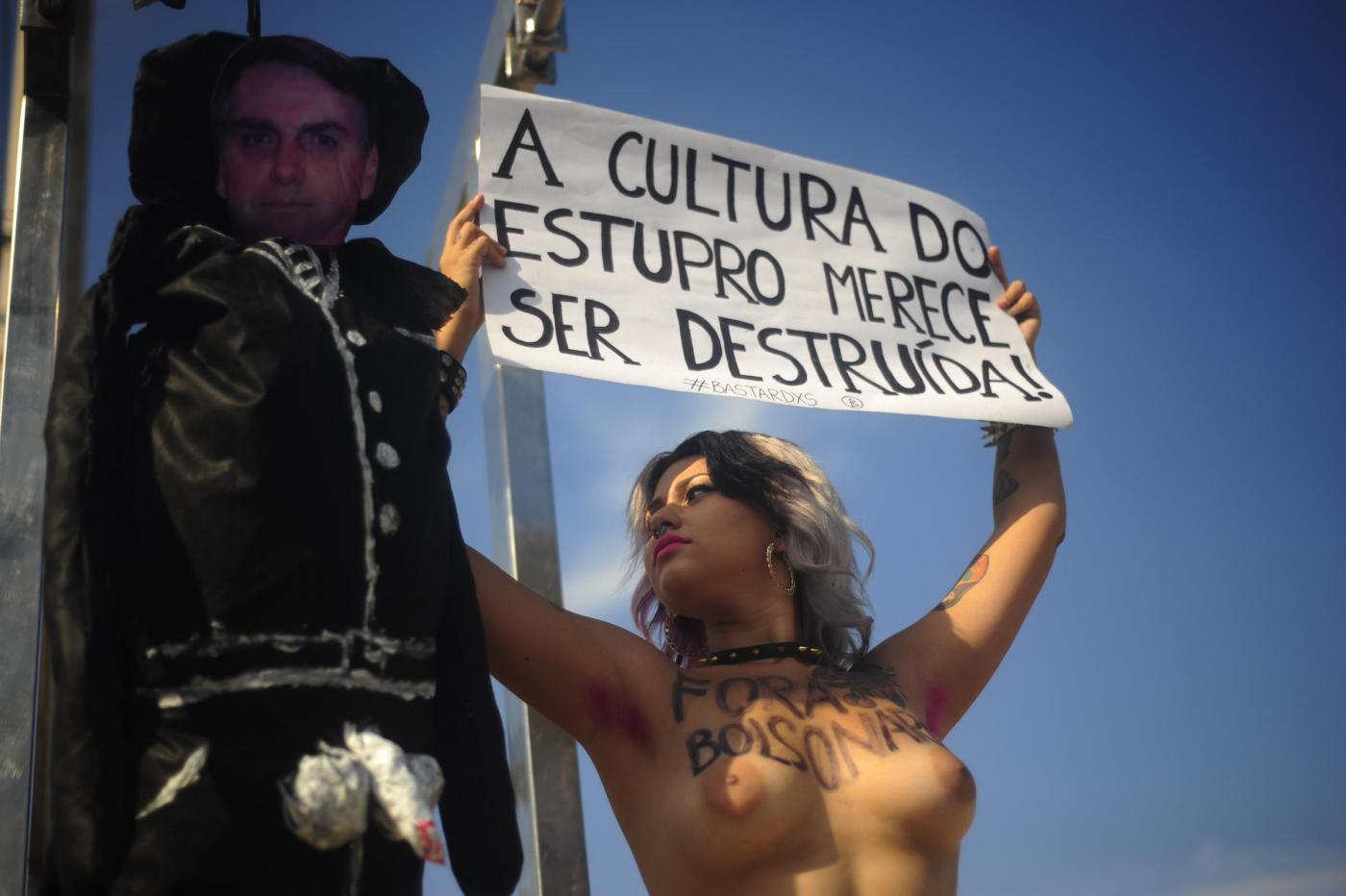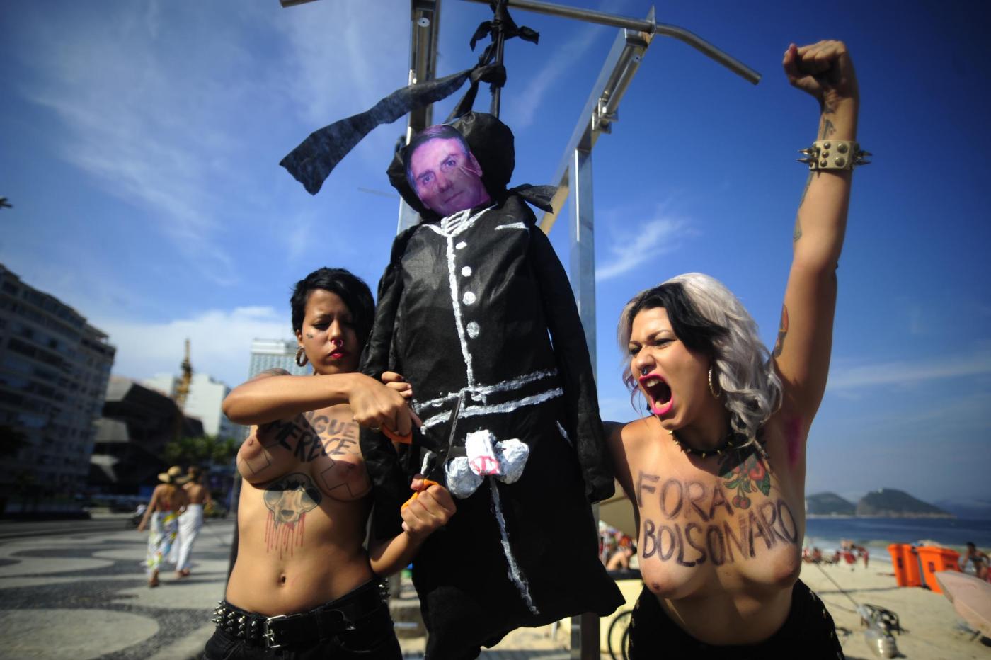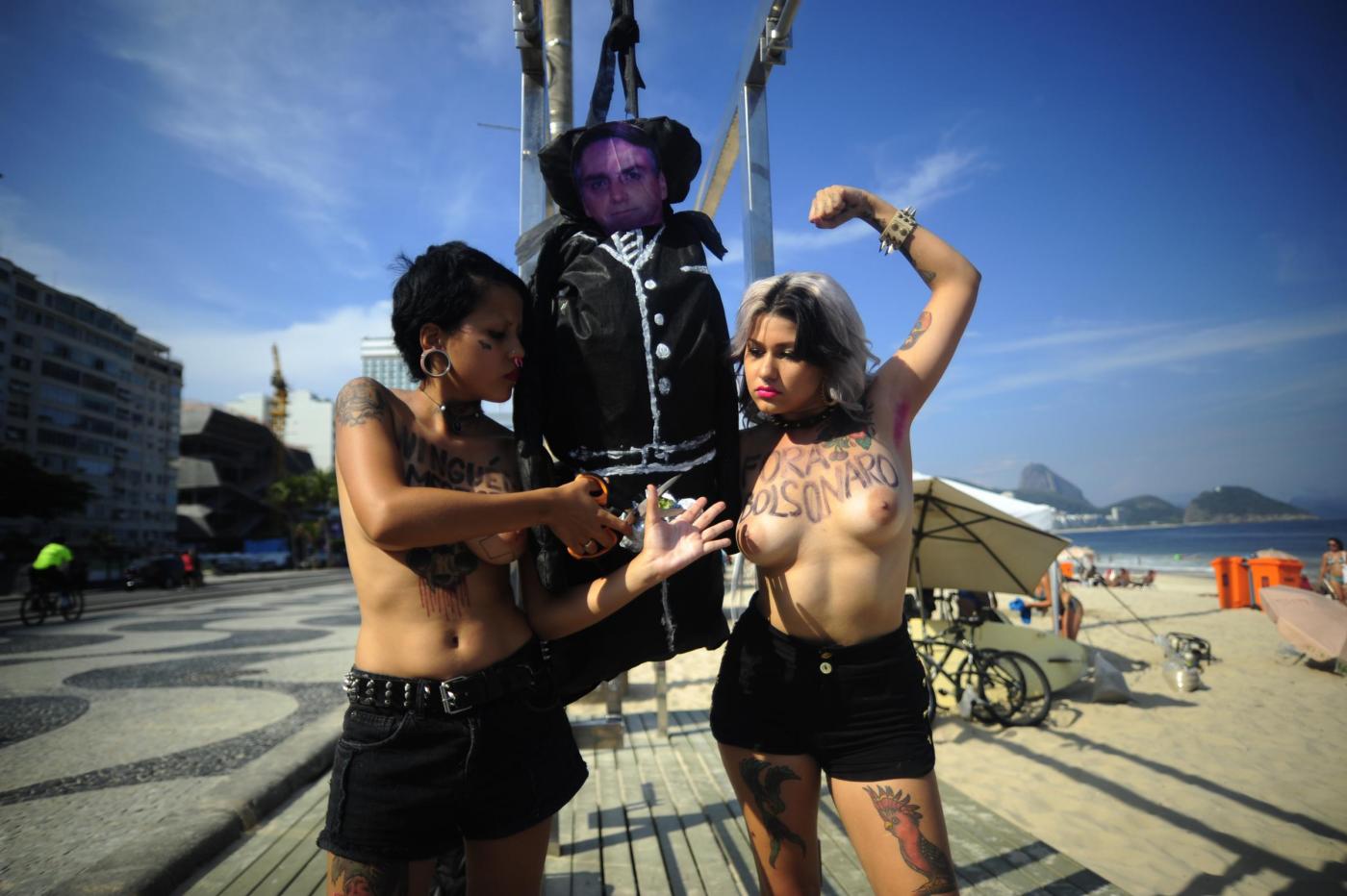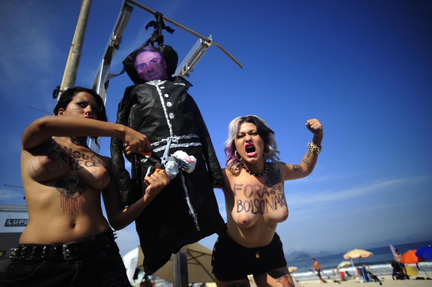 Il gruppo di femminista nato in Ucraina, oramai è diventato un fenomeno mondiale. Due militanti in topless hanno costruito un patibolo ed hanno impiccato un cartone raffigurante la faccia di Bolsonaro che, durante una sessione parlamentare, lo scorso 10 novembre alla collega aveva detto: “Non ti stupro solo perché non lo meriti” (foto LaPresse)