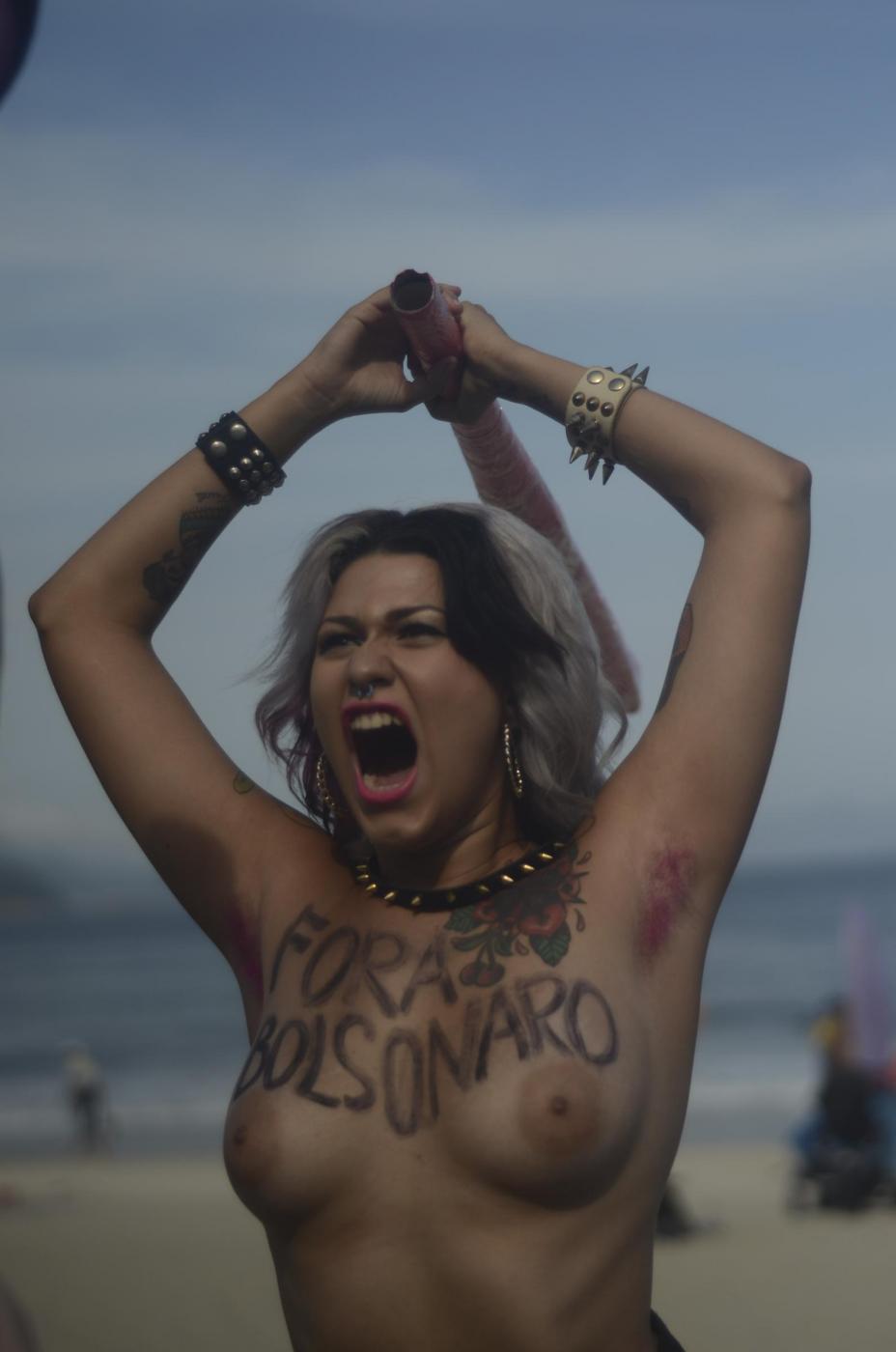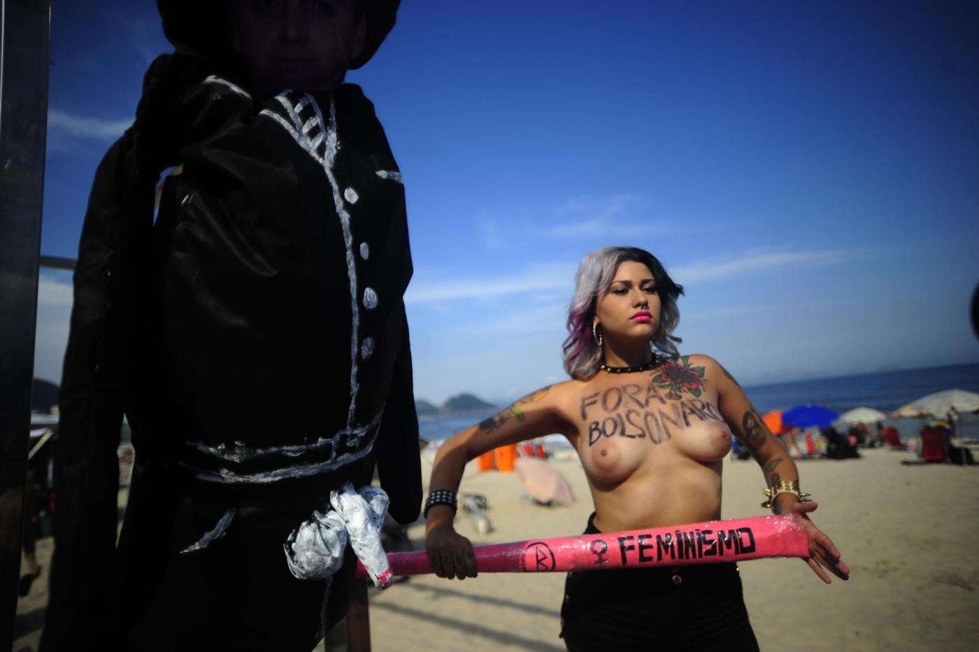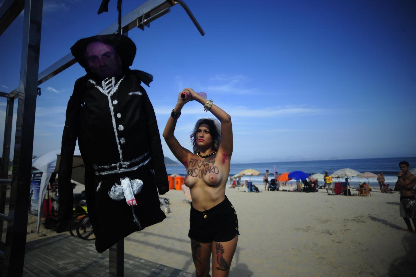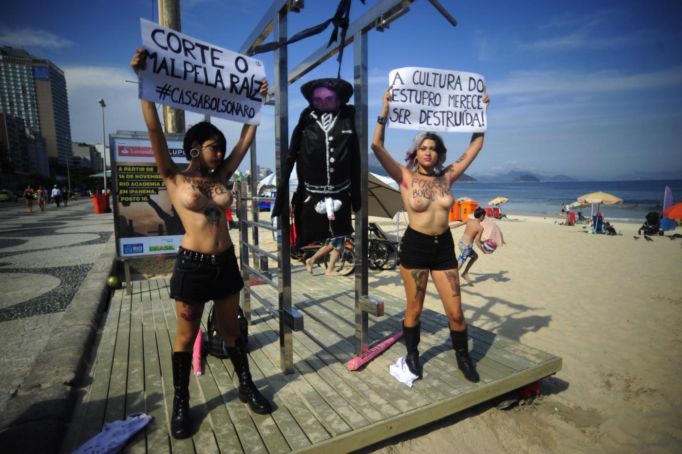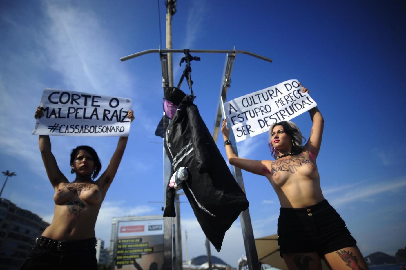 Il gruppo di femminista nato in Ucraina, oramai è diventato un fenomeno mondiale. Due militanti in topless hanno costruito un patibolo ed hanno impiccato un cartone raffigurante la faccia di Bolsonaro che, durante una sessione parlamentare, lo scorso 10 novembre alla collega aveva detto: “Non ti stupro solo perché non lo meriti” (foto LaPresse)