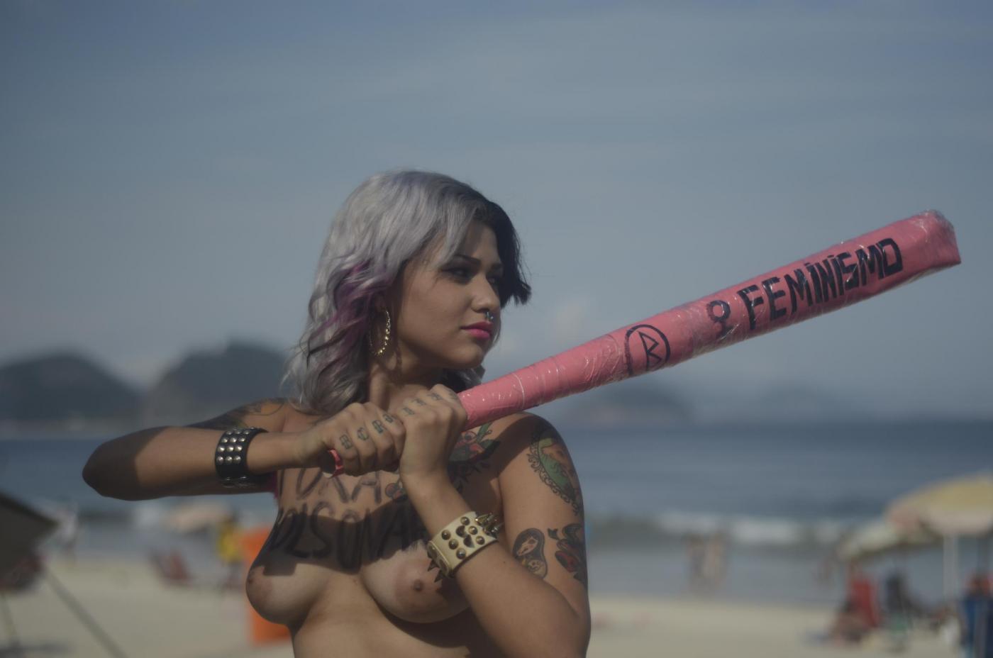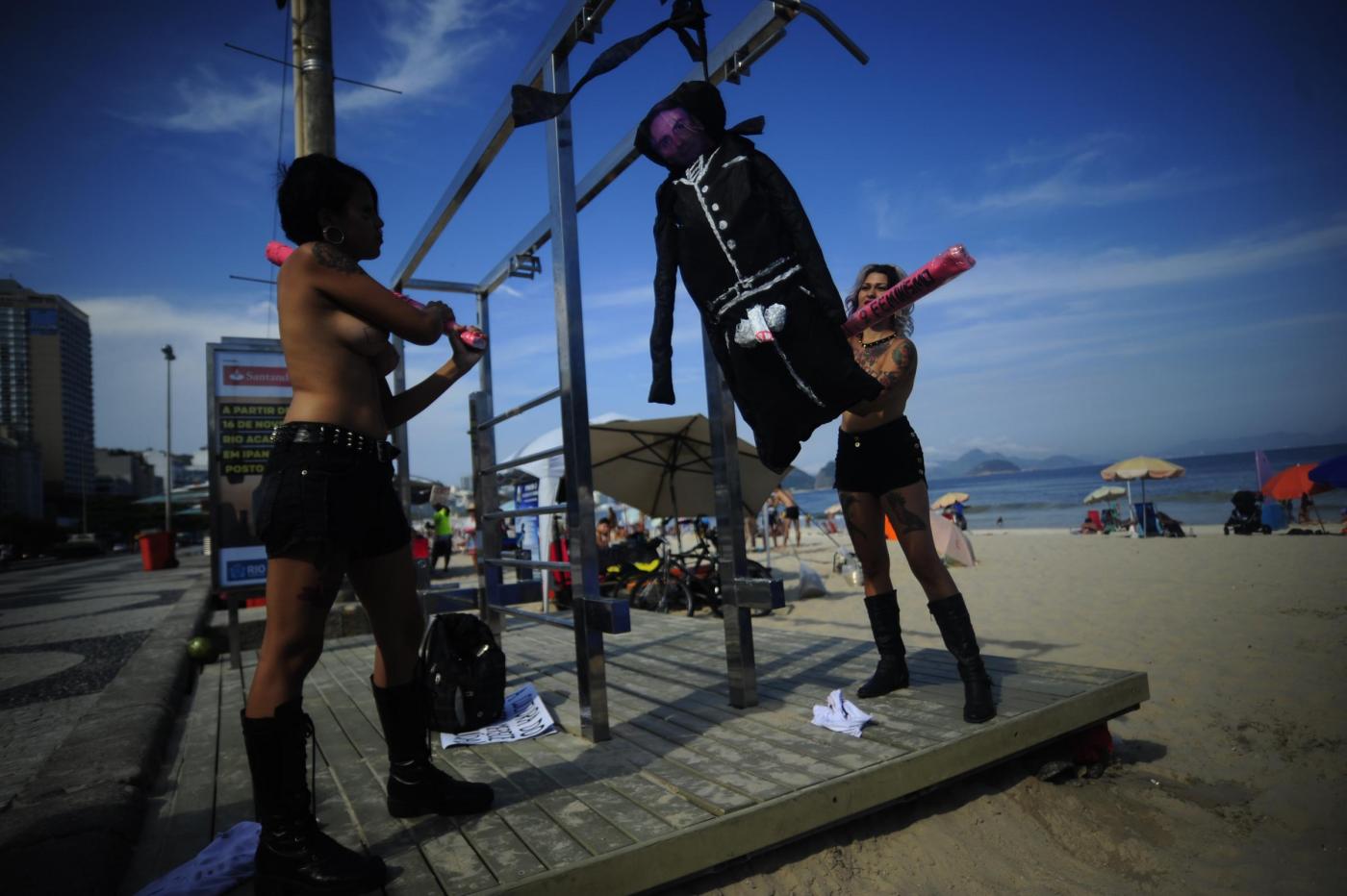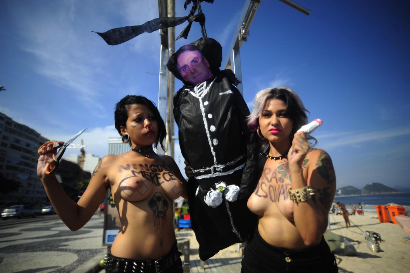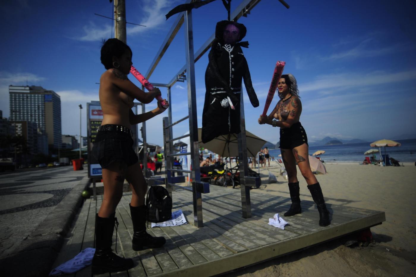 RIO DE JANEIRO – Per protestare contro il parlamentare della destra brasiliana Jair Bolsonaro che lo scorso 10 dicembre aveva rivolto parole pesantemente sessiste contro la deputata della maggioranza Maria Do Rosario, le Femen hanno simulato un’impiccagione del parlamentare sulla spiaggia di Copacabana a Rio De Janeiro, rigorosamente a seno nudo.
