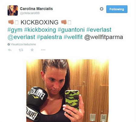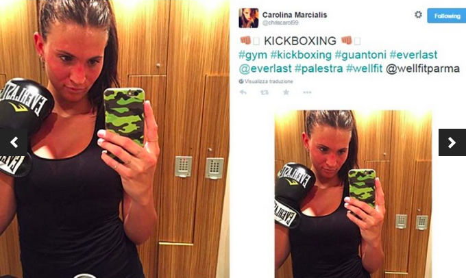 ROMA – Carolina Marcialis, l’avvenente moglie di Antonio Cassano, è famosa per la sua passione per il fitness e sul social network Twitter ha pubblicato un selfie in tenuta da kick boxing.