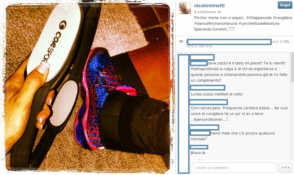 Ed è tornata con un provocante selfie con luce soffusa e capelli sul viso, oltre che alla foto di alcuni aggeggi per il fitness che, stando alla didascalia vergata da Nicole, dovrebbero essere in grado di regalarle delle #chiappesode dopo le critiche arrivate per essersi “lasciata andare”.