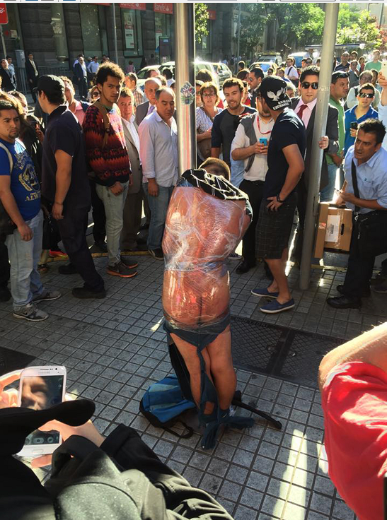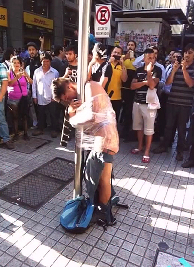 SANTIAGO DEL CILE – Il 32enne Valentino Abeyta Barrera è stato visto dalla gente mentre tentava di derubare un pensionato con un coltello. La folla inferocita ha così deciso di spogliarlo e di avvolgerlo dalla testa ai piedi in una pellicola trasparente. L’uomo è stato poi legato ad un lampione dove è rimasto per circa 20 minuti fino all’arrivo della polizia.