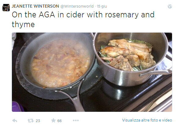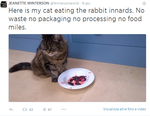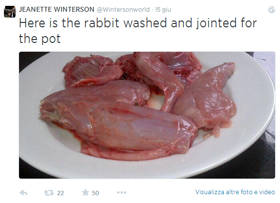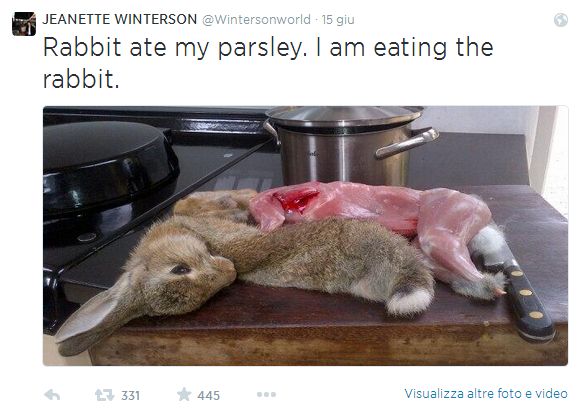 LONDRA – ”Il coniglio ha mangiato il mio prezzemolo, io sto mangiando il coniglio”: la scrittrice inglese Jeanette Winterson ha pensato bene di postare sul proprio profilo Twitter anche qualche foto dell’animale scuoiato per far capire che l’aveva fatto davvero.