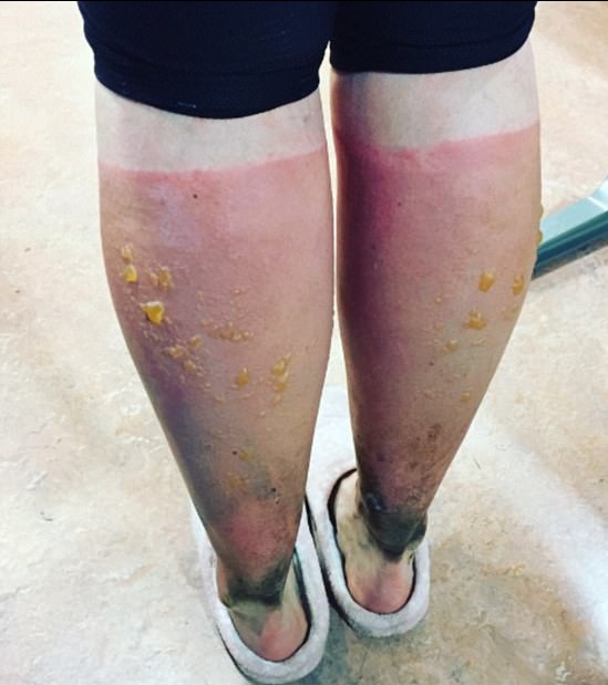 La mamma di due figli ha postato sul web delle enormi vesciche piene di pus di colore arancione che le si sono formate sulle gambe, provocate dal sole che batteva cocente sui maratoneti.