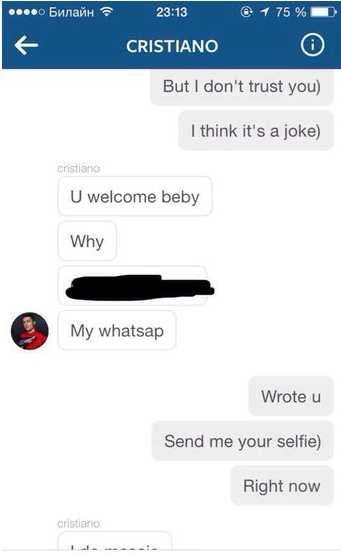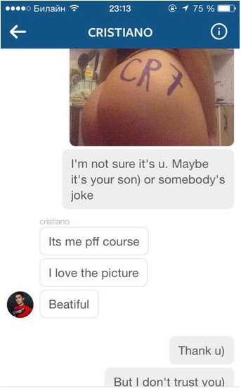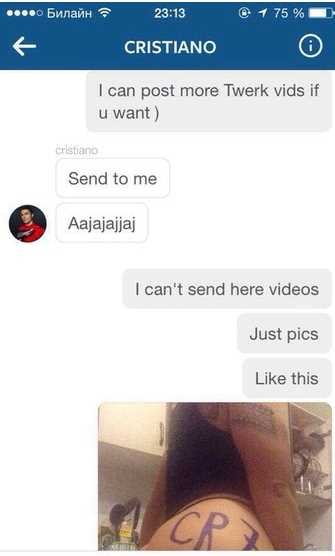 Alena era abbastanza increndula dell’accaduto e, dopo aver scambiato un paio di messaggi – non proprio innocenti e corredati di foto hot del suo fondoschiena – ha reso pubblici gli screenshot della conversazione sui social, poi immediatamente ripresa e pubblicata da un quotidiano sportivo russo. Resta il dubbio: si trattava proprio di Cristiano Ronaldo?