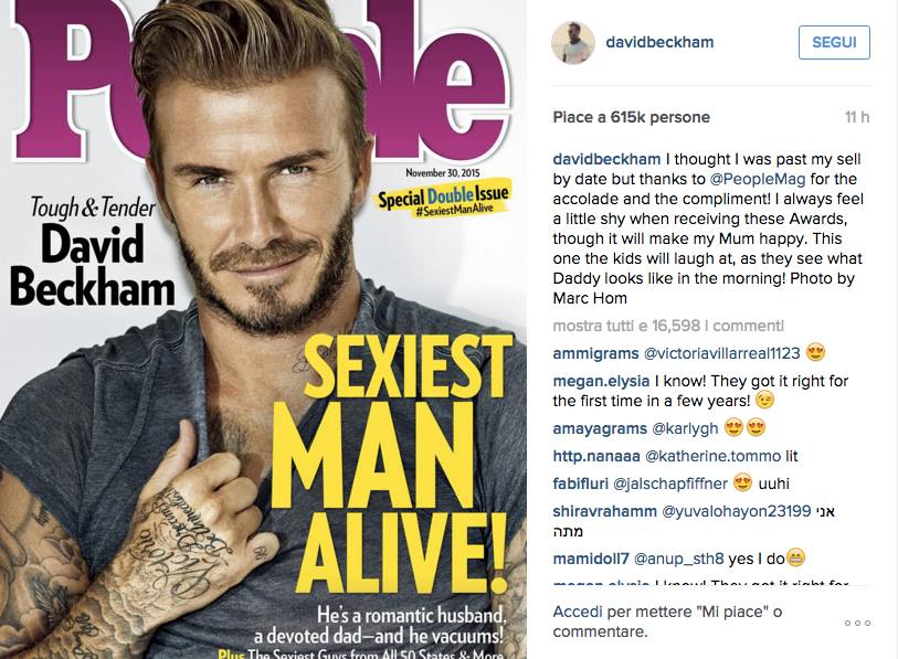 A 40 anni l’ex calciatore è orgoglioso del titolo: “Sono lieto di accettarlo. Victoria si è congratulata con me”, e su Facebook commenta così: “Divento un po’ timido quando ricevo questi premi, anche se mia mamma ne sarà felice. I bambini invece rideranno, perché sanno che aspetto ha il papà la mattina”, ammettendo di essere stato preso in giro dal figlio Brooklyn: “Sei sicuro che non sia io quello che dovrebbe stare su quella copertina?”. Intanto, modestia a parte, David che attraente è considerato da un bel po’ di tempo, si aggiunge alla classifica degli uomini più sexy del mondo da Harrison Ford (eletto nel 1998) a Richard Gere (1999), passando per Brad Pitt, Pierce Brosnam, Ben Affleck, Johnny Depp, Jude Law, Matthew McConaughey, George Clooney, Matt Damon, Hugh Jackman, Ryan Reynolds, Bradley Cooper, Channing Tatum, Adam Levine, Chris Hemsworth (eletto l’anno scorso).