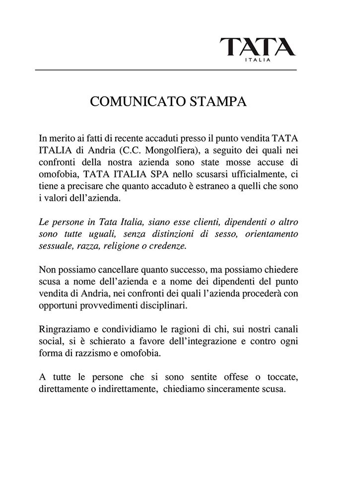 “In merito ai fatti di recente accaduti presso il punto vendita Tata Italia, a seguito dei quali nei confronti della nostra azienda sono state mosse accuse di omofobia, Tata Italia spa, nello scusarsi ufficialmente, ci tiene a precisare che quanto accaduto è estraneo a quelli che sono i valori dell’azienda. Le persone in Tata Italia, siano esse clienti, dipendenti o altro sono tutte uguali, senza distinzioni di sesso, orientamento sessuale, razza, religione o credenze. Non possiamo cancellare quanto successo ma possiamo chiedere scusa a nome dell’azienda e a nome dei dipendenti del punto vendita di Andria, nei confronti dei quali l’azienda procederà con opportuni procedimenti disciplinari. (…). A tutte le persone che si sono sentite offese o toccate, direttamente o indirettamente, chiediamo sinceramente scusa”.