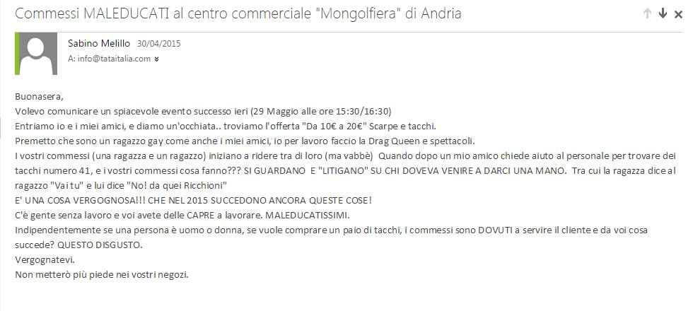 “Premetto che sono un ragazzo gay come anche i miei amici. I vostri commessi (un ragazzo e una ragazza) cominciano a ridere fra di loro (ma vabbè). Quando un mio amico chiede aiuto per trovare dei tacchi numero 41 e i vostri commessi cosa fanno? Si guardano e litigano su chi doveva venire a darci una mano. La ragazza dice ‘vai tu’ e il ragazzo risponde ‘no da quei ricchioni’. Vergognatevi: non metterò più piede in un vostro negozio”.