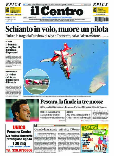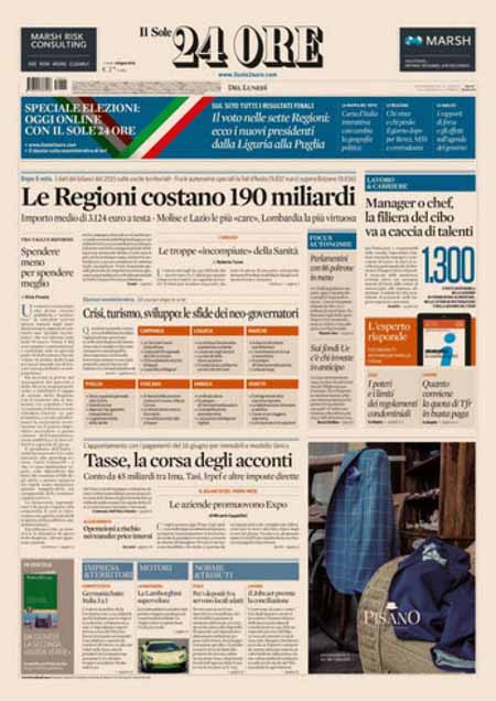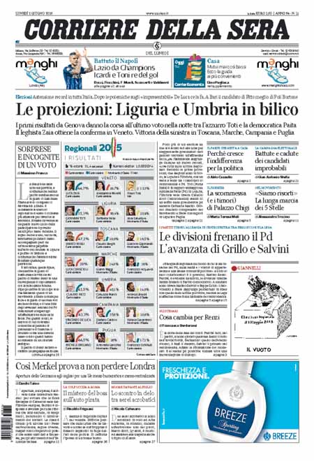 ROMA – Le prime pagine dei giornali di oggi, 1 giugno, aprono sui risultati delle elezioni regionali, ma lo spoglio è iniziato soltanto alle 23 e quindi la gran parte dei giornali ha deciso come titolare sulla base di exit poll e proiezioni. Altra notizia sulle prime pagine è l’incidente tra due piccoli aerei durante un Air Show sulle spiagge di Tortoreto (Teramo), prima dell’esibizione delle Frecce tricolori.
