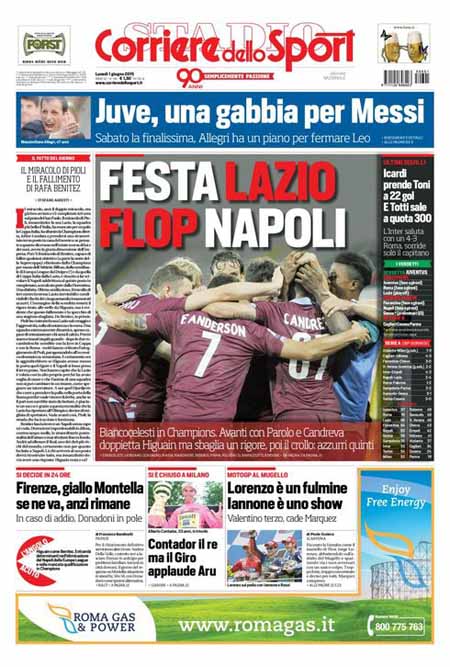 I giornali sportivi danno spazio all’ultima giornata di Serie A che ha visto la Lazio imporsi per 4-2 al San Paolo contro il Napoli e conquistare, così, l’accesso ai preliminari di Champions League.