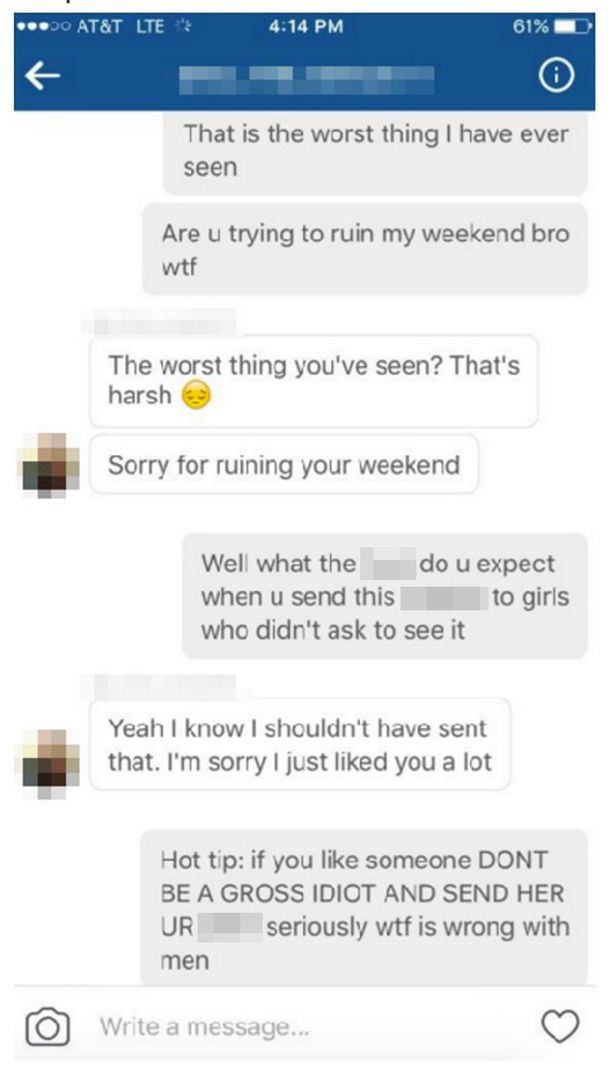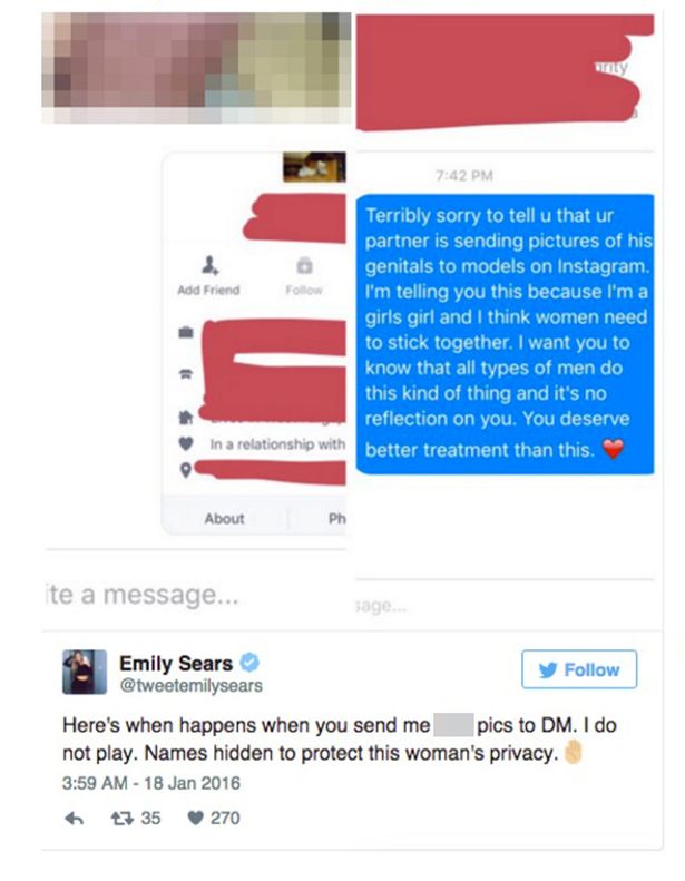 “Mi dispiace tanto doverti dire che il tuo ragazzo invia foto dei suoi genitali alle modelle su Instagram. Te lo sto dicendo perché penso che le donne debbano allearsi e perché tu meriti un trattamento migliore di questo”.