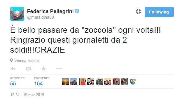 ROMA – “E’ bello passare da “zoccola” ogni volta!!! Ringrazio questi giornaletti da 2 soldi!!!GRAZIE”: Federica Pellegrini torna sulla vicenda “sbirciatina” al pacco di Gianluca Maglia. E attacca Novella 2000, la rivista che ha pubblicato le foto che immortalavano lo sguardo della nuotatrice al compagno di vasca.