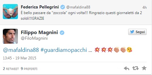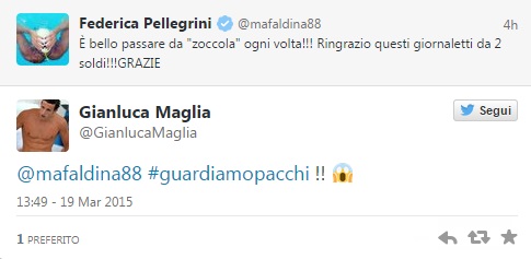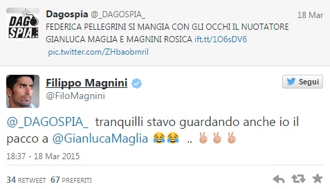 Già il compagno di Federica Pellegrini, Filippo Maginini, era intervenuto sulla vicenda via twitter, buttandola sul ridere: “Tranquilli, stavo guardando anche io il pacco a Gianluca Maglia”, aveva cinguettato.