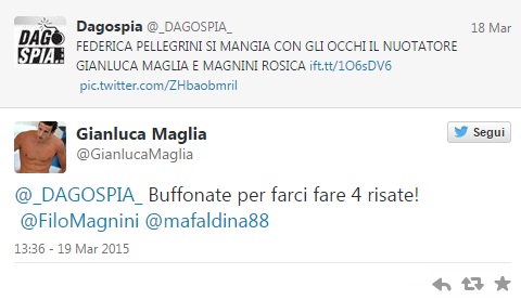 E adesso che la fidanzata ha replicato a Novella 2000 ha ritwittato il suo tweet, con tanto di emoticon che applaudono. Lo stesso Maglia ha detto la sua, sempre su Twitter: “Buffonate per farci fare 4 risate!”.