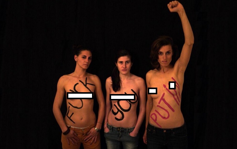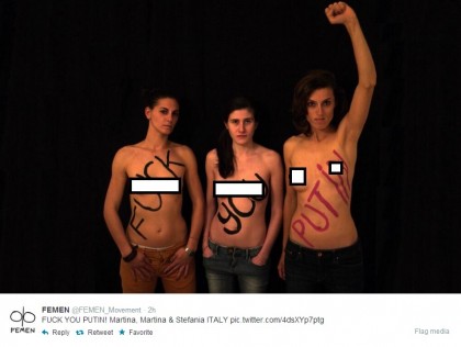 ROMA – Le Femen italiane solidarizzano con le colleghe russe postando su Twitter una foto con la scritta sul seno nudo “Fuck You Putin”. Le tre ragazze si chiamano Martina, Martina e Stefania e sul sito di Femen Italia spiegano i motivi che le hanno portate a questa presa di posizione. Ecco il comunicato pubblicato sul loro sito: