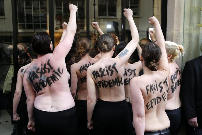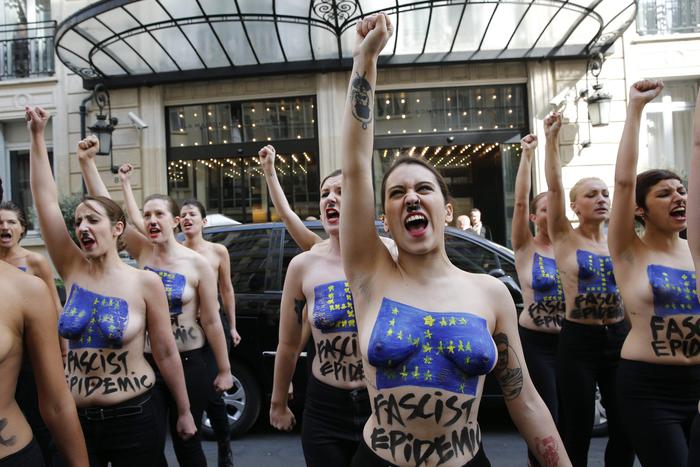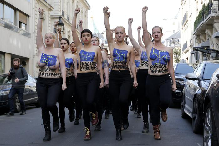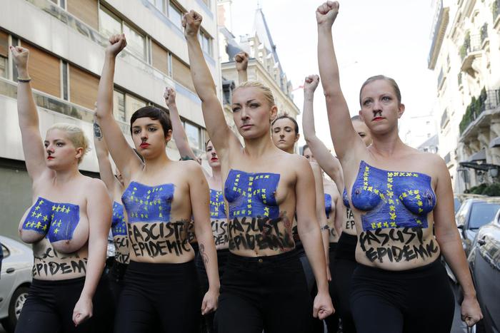 Gli slogan scanditi e scritti sul corpo delle Femen denunciano l’ “epidemia fascista” dei partiti nazionalisti ed euroscettici che “contamina” il Parlamento europeo nelle prossime elezioni. Il gruppo femminista è nato in Ucraina qualche anno fa. Negli ultimi tempi però, le Femen manifestano spesso a Parigi dopo che qui hanno stabilito il loro quartiere generale. Le ragazze infatti, sono state costrette a lasciare Kiev a causa delle continue minacce che hanno ricevuto.