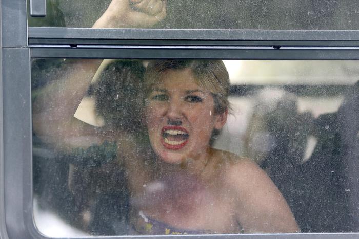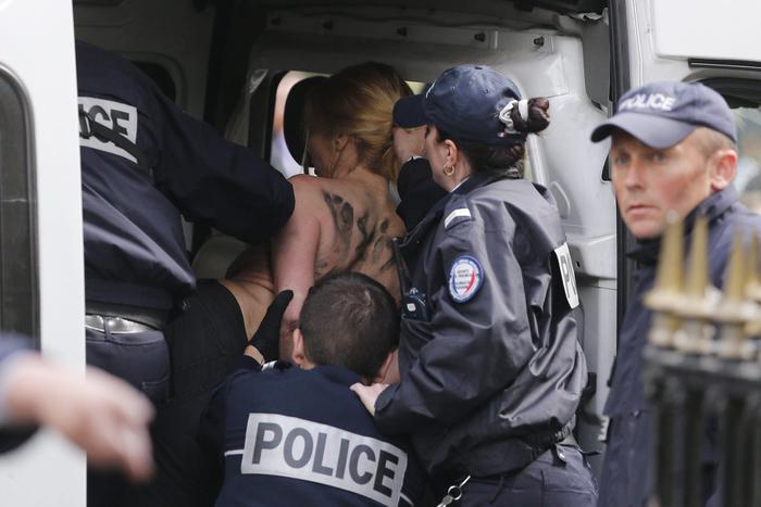 PARIGI – Una ventina di attiviste del collettivo femminista Femen, hanno protestato davanti all’edificio parigino in cui si teneva la presentazione ufficiale della campagna del Front National per le elezioni europee, a seno nudo e con disegni di bandiere europee e croci celtiche sul petto.
